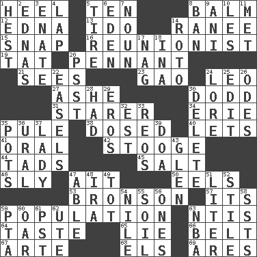 ACROSS 1. The bottom of a shoe or boot 5. "___ Little Indians" 8. Lip ointment 12. Pulitzer Prize-winning author Ferber 13. Wedding promise 14. The wife of a rajah (variant) 15. Fastener 16. One who advocates reunion 19. Make lace 20. Pre-World Series prize 21. Observes 23. E Mali city 24. Lion 27. American tennis player Robert 30. Texas town _ City 31. A viewer who gazes fixedly 34. One of the Great Lakes 35. Whimper 38. Administered medicine 40. Allows 41. Of the mouth 42. Moe Howard, for one 44. Bits 45. Table seasoning 46. Insidious 47. Small island 50. Snakelike fish 53. "Death Wish" actor 57. It is 59. Census information 63. Nuclear Threat Initiatives 64. Clothes sense 65. Whopper 66. Waist strap 67. Johnson of "Laugh-In" 68. Raised railways 69. Ancient Greek god of war DOWN 1. Behest 2. Ferber et al. 3. Maternal 4. Pet locale 5. Hoop that covers a wheel 6. Locale of original sin 7. Part of speech 8. Bar 9. Black tropical American cuckoo 10. French article 11. Was introduced to 14. Printing process, for short 17. Tired old horse 18. _ tizzy (2 wds.) 20. Inconspicuous attention getter 22. Artist's stands 24. Old wives' tales, e.g. 25. Prepare for publication 26. Lyric poems 28. Possessed 29. Greek god of love 30. Erase 32. Eastern Standard Time (abbr.) 33. Vintage cars 35. Cooking vessels 36. Mountain range 37. Kenny Rogers chart-topper in '80 39. ___ good deed 43. Small, secluded valley 47. Competent 48. Retirement account (abbr.) 49. Small child 51. 61 cubic inches 52. Vertical member of a panel or frame 54. Mediterranean tributary 55. Earth 56. Singles 58. Fast planes 59. Parent Teacher Association (abbr.) 60. Boat paddle 61. Pacific Standard Time (abbr.) 62. Shoshoni 63. Basketball assoc.