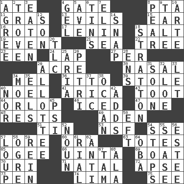 ACROSS 1. Had dinner 4. Yard entry 8. Parent Teacher Association (abbr.) 11. Pate de foie ____ 13. Vices 15. Hearing organ 16. Printing process, for short 17. Soviet premier 1918-24 18. Table seasoning 19. Happening 21. Ocean 22. Family _ (genealogy) 23. Car or cant ending 24. Pet locale 27. For each 29. Land measure 30. Rhinal 34. Cartoonist voice _ Blanc 36. "Tell ____ the Marines!" 39. Fur scarf 40. Christmas carol 41. N. Chile seaport 43. A blast of a horn 44. Fourth or lowest deck 46. On the rocks 47. Single 48. Musical pauses 49. An important port of Yemen 51. Metal container 53. Overdraft (abbr.) 54. Compass dir. 57. Old wives' tales, e.g. 60. Mouth or opening 63. Hauls 65. Double curve, resembling the letter S 66. National forest in Provo, Utah 69. Water vessel 70. RI univ. 71. Relating to or accompanying birth 72. Domed church section 73. Fenced enclosure 74. Pale green bean 75. Observe DOWN 1. Match 2. Collection of objects 3. Consumed 4. Set 5. "___ Maria" 6. Airtight sealed metal containers 7. Writer Wiesel 8. Lightbulb-shaped fruit 9. Falsehood 10. Johnson of "Laugh-In" 12. Male child 14. Fastener 18. Ski resort town in Vermont 20. Affectionate concern, for short 25. Operatic vocal solo 26. _ dish (used to culture cells) 28. Followers of ems 29. One to whom something is allotted 31. Within a short period 32. Medicinal plant 33. Allow 34. Greater amount 35. Snakelike fish 37. Nervous spasm 38. Sea 40. Or not 42. Does sums 45. 23rd letter of the Greek alphabet 50. Lizard (obsolete) 52. Part of speech 54. Discontinues 55. Gospel singer Marvin 56. First name in cosmetics 57. Central Nebraska county 58. Legendary monster 59. It's straight from the horse's mouth 61. Monetary unit of Yemen 62. Opposed to 64. Chief or king in Benin or Nigeria 67. Scottish cap 68. Chicken ___ king