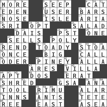 ACROSS 1. Greater amount 5. Ooze 9. Domesticated feline 12. Locale of original sin 13. One who uses or employs something 14. Long, evenly shaped pieces 15. Characteristic smell of wine 16. Small island 17. Operatic vocal solo 18. _ Lanka 19. Choose 21. Vegetable dish 22. Raised platform 24. Pacific Standard Time (abbr.) 26. Single 27. Makes a sale 28. More than one (prefix) 29. Tear apart 30. Sycophant 32. Portico 36. Single time 37. Large 38. Give a ring to 39. Baltic tributary 40. Abounding in pines 42. Silent film actress Nazimova 43. Ancient Greek god of war 44. Country estate 46. Fitting 49. Two (Sp.) 50. Part of Q.E.F. 51. Tear up 53. Girls' org. (abbr.) 54. Santa ___, CA 57. Utensil 58. Tall New Zealand timber tree 61. Having or resembling wings 62. Lodging establishments 63. Pismires 64. False hair 65. To separate or throw off 66. 90 degrees 67. At sea DOWN 1. Not women's 2. Scent 3. Home 4. Compass dir. 5. Set or collection 6. Curvy letter 7. Snakelike fish 8. Before (prefix) 9. Monte _, Las Vegas Hotel/Casino 10. Believer in; advocate of (suffix) 11. Sadhe (variant) 14. Sound made by sheep 19. Lubricate 20. Inconspicuous attention getter 21. Filthy place 23. Tree or shrub in the Birch family 24. Porridge 25. Insidious 27. Post 28. Aches 29. Friend of Pooh 31. Off-Broadway awards 32. Any of the three canals of the cochlea 33. Baron Munchausen's specialties 34. Spanish pot 35. According to 40. Adept person 41. Jacques Cousteau's middle name 43. Say or write further 45. Lyricist Gershwin 46. Having gotten out of bed 47. Give a jingle 48. Marketplace scale 52. Raised railways 53. Abrupt rush of wind 55. Nathan's nickname 56. Type of rug 58. Actress Charlotte 59. _ tizzy (2 wds.) 60. Mountains (abbr.) 61. "One Day ___ Time"