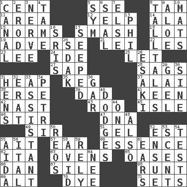 ACROSS 1. Penny 5. Compass dir. 8. Scottish cap 11. Length times width 12. Sharp bark 14. According to 15. Typical models 17. Box-office sellout 18. Car dealer's back yard 19. Contrary to your interests or welfare 21. Flowery wreath 22. French article 23. Area sheltered from the wind 24. Binary compound 25. Allow 27. Plant excrement 28. Sinks 31. Pile 35. Cask 37. Jai _ 38. Celtic language 39. Male parent 41. Peachy ____! 42. Political cartoonist Thomas 43. Friend of Pooh 45. Small island 46. Commotion 47. Heredity factor (abbr.) 49. Title for a knight 51. Set 52. Eastern Standard Time (abbr.) 55. Small island 57. Ewer handle 60. Core 62. Call ___ day 63. Baking chambers 65. Fertile tracts in a desert 66. Daniel's nick name 67. Drop; flow; fall 68. Undersized animal 69. Keyboard modifier key 70. Color 71. Arranges properly for use DOWN 1. Lessep's creation 2. Eat (away) 3. Effrontery 4. Docile 5. Symbol (abbr.) 6. Lick closed 7. Otherwise 8. Baron Munchausen's specialties 9. _ vera 10. Floor protectors 13. Silvers or Donahue 16. Indian titles of respect 17. Oozed 20. Neighbor of Neb. 26. 1973 Nobel Price Winner (Physics) Leo 29. Highlander 30. Trig term 31. Coop moms 32. Part of Q.E.F. 33. Aide 34. _ dish (used to culture cells) 36. Slender fish 40. Evades 44. Singles 48. In addition 50. Vintage cars 52. Take place subsequently 53. Odor 54. Trials 55. Opera by Verdi 56. Slanted text style (abbr.) 58. Enthusiastic 59. Have trust in 61. Hearing organs 64. Born