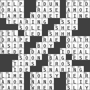 ACROSS 1. Assist 5. Goddess of spring and wife of Bragi 9. Nourish 13. Taken by mouth 14. To erase 15. Mine, in Marseilles 16. Not wild 17. Music written for nine 18. Actor's bit 19. Lacerating 21. Fast jet (abbr.) 22. Flatfish 23. "______ My Girl" (Turtles hit) 24. Snakelike fish 27. Directed 28. Quiet! 29. Window treatment 31. Actress Charlotte 32. Pledge 36. SW Saudi Arabia district 37. Male child 38. Butter sub 39. Ancient Persian 40. Pat or tap gently 41. Standard of perfection 42. Within a short period 44. Paper or plastic container 46. Compass dir. 47. Airtight sealed metal containers 48. Greek god of love 50. Binary compound 51. Catching in a trap 54. Citrus frut 56. Annoyingly loud 58. Rump 60. Soon (poet.) 61. Billionth: prefix 62. Writer Wiesel 63. Piece 64. Songbird 65. Kill DOWN 1. Being at a high temperature 2. Part of Q.E.F. 3. Unable to walk 4. Entreaties 5. Pressed 6. Mild oath, euphamism for damn 7. Purpose 8. Remaining after all deductions 9. It jiggles the polygraph 10. Gives off 11. Period of immesurable duration 12. Expire 17. The longest river in the world 20. Hero or heavy, e.g. 21. Quiet! 23. A female animal or person 24. Dutch treat 25. Celtic language 26. Put down 28. Declare 30. Elected leader of a country 31. Director Reiner 33. Toward shelter 34. Beverages made from leaves 35. Opening into or through something 37. Bar 40. Two (Sp.) 41. Composer Stravinsky 43. Single 44. Gillaume's butler role 45. Like ___ of sunshine 47. Southeast Indonesia island 49. Founders of families 51. Trig term 52. 1994 drama film starring Jodie Foster 53. Greek goddess of the earth (variant) 54. Pet locale 55. _ tizzy (2 wds.) 56. Compass dir. 57. Boat paddle 59. Marina Del _, California