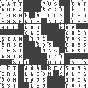 ACROSS 1. Electrical Unit 5. Fluid product of inflammation 8. Feline 11. Type of rug 12. Scram, to a cat 14. Connecticut Ivy Leaguer 15. Singer Mel 17. Beverly of Met fame 18. Directed 19. Substance 21. _ moment's notice (2 wds.) 22. Area sheltered from the wind 23. To riddle 24. June honoree 25. Hit sharply and swiftly 27. Single 28. "Mermaids" star 31. Thailand, formerly 35. Three (prefix) 37. Casino tip 38. Celtic language 39. Distress signal 41. Washington bills 42. Trial 43. Tired old horse 45. A home for chicks 46. SW Saudi Arabia district 47. Make lace 49. Put into a specified state 51. Shoshoni 52. Ocean 55. Allow 57. American Automobile Association (abbr.) 60. Thinks logically 62. Retirement account (abbr.) 63. The state of being joined or united 65. Table seasonings 66. Spanish title 67. Small boys 68. It may be bright or harebrained 69. Fast jet (abbr.) 70. Lion 71. Dormintory (informal) DOWN 1. Wetness 2. Came up 3. Laconic 4. Not wild 5. 23rd letter of the Greek alphabet 6. Southern CA. univ. 7. Table seasoning 8. Portable communications device 9. Toward shelter 10. Event that recurs at intervals 13. Russian ruler of old 16. Inside; within (prefix) 17. Spring feasts 20. Patter 26. 13-14th century defensive garment 29. Makes supply last 30. Respite 31. Stalk of a moss capsule 32. Angers 33. Helper 34. Distance measurement (Brit.) 36. Electrically charged atom 40. Titan orbits this 44. Yard entry 48. Afternoon social gatherings 50. Tense 52. Twentieth part of a lira 53. Keyboard key 54. Indian state 55. Flaplike coverings 56. Greek god of love 58. Of or related to the anus 59. Helper 61. Expressed in words 64. Bear (Spanish)