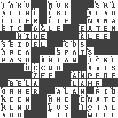 ACROSS 1. Pacific island yam 5. Or not 8. Indian title of respect (Mr.) 11. Place in a line 13. Supplement with great effort 14. Having or resembling wings 15. 61 cubic inches 16. Falsehood 17. Grandmother 18. And so on (abbr.) 19. Stare at amorously 21. Eroded 22. Flintstone garb 24. Toward shelter 25. Beer mug 27. Music discs 29. Type of rug 30. Arguments over trivial matters 32. Romantic infatuation 33. Believer in; advocate of (suffix) 35. Puff or smoke 39. Happen 41. Deliberation 42. Last letter of the English alphabet 43. Electrical Unit 45. Actor Lugosi 48. Cowardly lion portrayer 49. Abalone 50. ____ Jay Lerner 52. To free from 55. Peachy ____! 56. Madame (abbr.) 57. Related on the mother's side 59. Tear apart 60. Greek goddess of the dawn 61. "_____ Recall" 62. Say or write further 63. Teat (slang) 64. Water source DOWN 1. Lie 2. Set down 3. Actors Guy, Robert Welles, and Clint 4. Single 5. 1994 drama film starring Jodie Foster 6. Migrant worker of the '30s 7. To separate or throw off 8. Schedule 9. The wife of a rajah (variant) 10. SW Asia republic 12. Eat (away) 14. Of or related to the anus 20. Set 21. 90 degrees 23. Potato state 25. Plant excrement 26. Epoch 27. Numbers guy (abbr.) 28. Daniel's nick name 30. Title for a knight 31. Staphylococcus 33. Adept person 34. Regret 36. Make much ado about nothing 37. Apertif with cassis 38. Compass dir. 40. Russian ruler of old 43. Chicken ___ king 44. French painter Edouard 45. A special lineage 46. Make improvements or corrections to 47. Grant temporary use of 49. Gumbo ingredient 50. Mine, in Marseilles 51. For fear that 53. Slanted text style (abbr.) 54. Small valley 56. Was introduced to 58. At this time