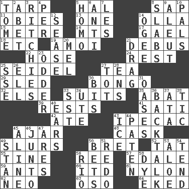ACROSS 1. Canvas cover 5. Actor Linden 8. Plant excrement 11. Off-Broadway awards 13. Single 14. Spanish pot 15. Distance measurement (Brit.) 16. Mountains (abbr.) 17. Highlander 18. And so on (abbr.) 19. Mine, in Marseilles 21. To get out of a bus 22. Stockings 24. Respite 25. Beer mug 27. Afternoon social gathering 29. Downhill vehicle 30. Beat drum 32. Otherwise 33. Sets of matching outer garments 35. Blind as ____ 39. Musical pauses 41. Suttee (variant) 42. Had dinner 43. Medicinal drug used to evoke vomiting 45. Partly open 48. Keg 49. Disparaging remarks 50. Cy Young winner Saberhagen 52. Make lace 55. Prong on a fork 56. To separate or throw off 57. Peak District village in England 59. Pismires 60. It would 61. High-strength synthetic material 62. Modern: prefix 63. Bear (Spanish) 64. Made supply last DOWN 1. Heavy book 2. Collude with 3. Actors Guy, Robert Welles, and Clint 4. For each 5. Like (prefix) 6. Against 7. French article 8. Thick slices 9. Native American of Southwest Alaska 10. Friends 12. Gospel singer Marvin 14. Double curve, resembling the letter S 20. Cartoonist voice _ Blanc 21. To be drawn or hauled along 23. More peculiar 25. Compass dir. 26. Pipe bend 27. Small child 28. Followers of ems 30. Again 31. Fertile tracts in a desert 33. Fast jet (abbr.) 34. Shoshoni 36. Sass 37. "One Day ___ Time" 38. Nervous spasm 40. Hearing organs 43. Frozen water 44. Eucharist need 45. Place in a line 46. Secret group 47. Ancient Greek god of war 49. Comedian Laurel of Laurel & Hardy 50. Wagers 51. Redecorate 53. _ vera 54. Look after 56. River (Sp.) 58. Color