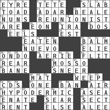 ACROSS 1. Jane of fiction 5. Wig 9. Broad, flat, thick piece 13. Frog relative 14. The sixth month of the Jewish calendar 15. Memphis, Tenn. Street 16. Religious women 17. One who advocates reunion 19. "We ___ not amused" (Victoria) 20. Period of immesurable duration 21. Lyricist Gershwin 22. Two (Sp.) 23. Snakelike fish 25. Eastern Standard Time (abbr.) 26. Eroded 30. Lip ointment 34. New (sp.) 35. Writer Wiesel 36. Southwest Nigerian state 39. Nest on high 42. Sudden quick movement 43. Tail end 44. With motion or animation 46. Object of repulsion 47. Contemptuous expression 48. Floor protector 51. Shed a tear 54. Music discs 57. Single 58. Bar 60. Wind 62. Subcutaneous 65. Toward the sea 66. Related on the mother's side 67. Dry up 68. Religious group 69. Monthly bill 70. Otherwise 71. Toward shelter DOWN 1. Inactive volcano in Sicily 2. You are 3. Indian princess (variant) 4. Begley and Asner 5. Pacific island yam 6. Genesis locale 7. The 19th letter of the Greek alphabet 8. Bert's buddy 9. Elected rep. 10. Put down 11. In addition 12. Stakes 15. Water vessel 18. Big collection agency 20. He sold his birthright 24. Poe poem 27. Beverage made from leaves 28. First lady 29. Typical standards 30. Prior to 31. Everything 32. Cards in a Roman deck? 33. Was introduced to 36. Globe 37. Teachers' org. 38. One of the 12 tribes of Israel 40. Electrically charged atom 41. Compass dir. 45. Stitched 48. Method 49. A saturated hydrocarbon 50. Laconic 52. Artist's stand 53. Part 54. "Mermaids" star 55. Centimeter-gram-second unit of force 56. Connect, as a bridge 58. Prejudice 59. Measure of real estate 61. Pace 63. Baseball player Mel 64. Cartoonist voice _ Blanc 65. White ___ sheet