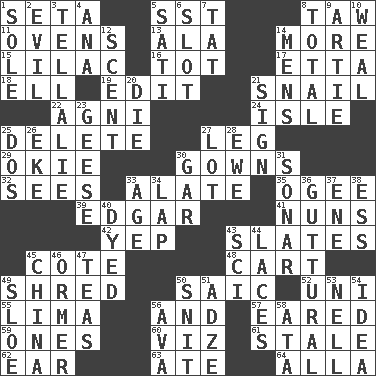ACROSS 1. Bristle 5. Fast jet (abbr.) 8. The 23rd letter of the Hebrew alphabet 11. Baking chambers 13. Chicken ___ king 14. Greater amount 15. Pale purple color 16. Small child 17. Singer James 18. Pipe bend 19. Prepare for publication 21. Slow-paced one 22. Hindu god of fire 24. Capri or Wight 25. Keyboard key 27. Part of a journey 29. Migrant worker of the '30s 30. Brides' dresses 32. Observes 33. Having winglike extensions 35. Double curve, resembling the letter S 39. _ Allan Poe 41. Religious women 42. Slangy assent 43. Chalkboards 45. ____ d'Azur (French Riviera) 48. Draw slowly or heavily 49. Fragment 50. Ketch in the Levant 52. University (slang) 55. Pale green bean 56. Added to 57. Having ears or earlike features 59. Singles 60. Namely 61. Showing deterioration from age 62. Hearing organ 63. Had dinner 64. Silent film actress Nazimova DOWN 1. Flatfish 2. Morally bad or wrong 3. Copy Pinocchio 4. Santa ___, CA 5. Suttee (variant) 6. Groove 7. Make lace 8. "_____ Recall" 9. Nick name for Arthur 10. Welt 12. Odor 14. Not women's 20. Pass on 21. Attach a signature 23. Honkers 25. Two (Sp.) 26. Make supply last 27. Car dealer's back yard 28. She-sheep 30. Slender fish 31. Underwater navigation system 33. Personal question 34. Pet locale 36. From the throat 37. Compass dir. 38. Curvy letter 40. Colored 43. _-fi 44. Shoestrings 45. Large country 46. Abalone 47. Afternoon social gatherings 49. A type of plum 50. In a ____ (agitated or irritated) 51. Edge tool used to cut and shape wood 53. 1994 drama film starring Jodie Foster 54. The main thing one is thinking about 56. Actress Gardner 58. "One Day ___ Time"