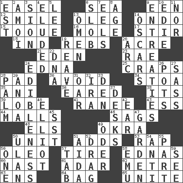 ACROSS 1. Artist's stand 6. Ocean 9. Car or cant ending 12. Grin 13. Cassini of fashion 14. Southwest Nigerian state 15. Woman's close-fitting hat 16. Undercover agent 17. Tumult 18. Working for oneself (abbr.) 19. Confederate soldiers (slang) 20. 43,560 square feet 21. Locale of original sin 23. Actress Charlotte 24. Pulitzer Prize-winning author Ferber 25. Dice game 28. Groovy apt. 30. Keep away from 34. Portico 35. Black tropical American cuckoo 36. Having ears or earlike features 38. It is 39. Ear part 41. Indian princess (variant) 43. Double-curved letter 44. Promenades 46. Sinks 48. Raised railways 49. Gumbo ingredient 50. A single undivided whole 51. Does sums 53. Hit sharply and swiftly 56. Butter sub 57. Hoop that covers a wheel 58. Ferber et al. 60. Political cartoonist Thomas 61. The sixth month of the Jewish calendar 62. Distance measurement (Brit.) 63. Followers of ems 64. Container for groceries 65. Join together DOWN 1. Eastern Standard Time (abbr.) 2. Mine, in Marseilles 3. The Jewish people; Israel 4. Dodged 5. Area sheltered from the wind 6. Messy guy 7. Snakelike fish 8. Ripen 9. Pleas 10. Singer Brickell 11. And not 13. Sign of something about to happen 14. Motion picture awards 19. Rob, plunder, or pillage 20. Curve 22. Heredity factor (abbr.) 24. The property of being fit to eat 26. Plant holders 27. Backtalk 28. Inside of hand 29. Small Philippine buffalo 31. Boat paddle 32. Lyricist Gershwin 33. Lair 37. Writing tables 40. American author Paul (1891-1958) 42. Ewer handle 45. Fast jet (abbr.) 47. Place where plants grow 49. River in Europe 50. ____ Bator 51. Opera by Verdi 52. To trail on the ground 54. Opposed to 55. Piece 56. Single 57. Keyboard key 58. Australian flightless bird 59. Observe