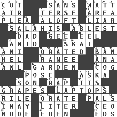 ACROSS 1. Small bed 4. Without 8. Electrical Unit 12. Atmosphere 13. Laconic 14. Length times width 15. Entreaty 17. High up in or into the air 18. One who doesn't tell the truth 19. Deli grouping 21. Most capable 23. Male parent 24. Turn to the right 26. Snakelike fish 27. Among 28. Three-handed card game 30. Cuckoo 31. Declaimed 34. Bar 37. Cartoonist voice _ Blanc 38. The wife of a rajah (variant) 39. Santa ___, CA 40. Leather borer 41. Place where plants grow 42. Gear tooth 43. Introduce or present, as a question 44. "____ silly question..." 46. Male offspring 47. Strike 50. It is 51. Wine fruits 54. Portable computers 57. Cause heat under the collar 58. Declaim 60. Friends 62. "If ____ say so..." 63. 61 cubic inches 64. Corporate head (abbr.) 65. Unadorned 66. Paradise 67. Begley and Asner DOWN 1. Head covering 2. Petroleums 3. Excercise machine 4. Former Milwaukee Brewers owner Bud 5. Came up 6. Science/research agcy. 7. Bristle 8. Place for singles 9. Satellite of Uranus 10. Afternoon social gatherings 11. Small pie 13. Scottish cap 16. Jai _ 20. Find the sum of 22. Necklace unit 25. First name in cosmetics 27. Afresh 29. Peachy ____! 30. Nanny (var.) 31. Mouths or openings 32. More valued for its uncommonness 33. Also 34. Keyboard key 35. Small Philippine buffalo 36. Tired old horse 41. Went 43. Wimpy's pal 44. Small island 45. Halt 46. First course 48. Having winglike extensions 49. Eucharist need 51. Amused look 52. Tall New Zealand timber tree 53. Not divided or shared with others 55. For each 56. Downhill vehicle 59. To free from 61. Mayday