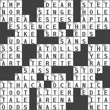 ACROSS 1. Naughty child 4. Letter starter 8. Proofreading order 12. And not 13. Scorch 14. Hollow 15. Length times width 17. _____ Park, CO 18. Capital of Western Samoa 19. Substance 21. Trios 23. D.D.E's nickname 24. Indian title of respect (Mr.) 26. Begley and Asner 27. Allodial 28. Without 30. Compass dir. 31. Ringlike coral islands and reefs 34. Definite Article 37. Car or cant ending 38. The wife of a rajah (variant) 39. Consenting reply 40. Tate display 41. Cigar-shaped 42. Actress Charlotte 43. Backtalk 44. Discontinue 46. 100% 47. It is 50. Nervous spasm 51. New York city 54. Pertaining to the sea 57. A blast of a horn 58. 61 cubic inches 60. Singer Brickell 62. Lie 63. Sports stadium 64. Call ___ day 65. Likelihood 66. Political cartoonist Thomas 67. Remaining after all deductions DOWN 1. _ tizzy (2 wds.) 2. Greater amount 3. Elected leader of a country 4. Flat circles 5. Keyboard key 6. Mature 7. Repose 8. Broken pieces 9. Drinks excessively 10. Writer Wiesel 11. Beverages made from leaves 13. Elected rep. 16. "____ silly question..." 20. Snakelike fish 22. Coop moms 25. Small island 27. One who uses or employs something 29. Toward shelter 30. Ocean 31. Ancient Greek god of war 32. Tarsus (plural) 33. Single 34. Polypeptide antibiotic 35. Pile 36. Compass dir. 41. Baby powder 43. Chalkboards 44. R.R. building 45. Prong on a fork 46. Hold, grip (Informal) 48. Hauls 49. Aroma 51. "Tell ____ the Marines!" 52. Frog relative 53. Actor Alda or Thicke 55. Period 56. Quote 59. Lyricist Gershwin 61. Erode