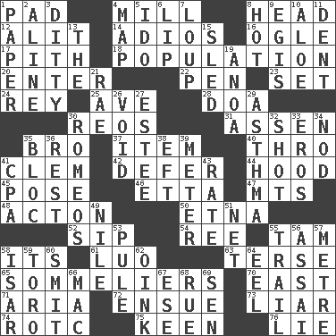 ACROSS 1. Writing tablet 4. Place where flour is made 8. Froth on beer 12. Set down 14. Goodbye (Sp.) 16. Stare at amorously 17. Essential or central part 18. Census information 20. Keyboard key 22. Writing instrument 23. Put into a specified state 24. Marina Del _, California 25. "___ Maria" 28. ___ good deed 30. Vintage cars 31. NE Netherlands city 35. Sis' sibling 37. Detail 40. Through, poetically 41. Clement's nick name 42. Postpone 44. Parka part 45. Introduce or present, as a question 46. Singer James 47. Mountains (abbr.) 48. Gambison 50. Inactive volcano in Sicily 52. Small drink 54. Portuguese money of account (variant) 55. Scottish cap 58. ___ a Wonderful Life 61. Nilotic language 63. Laconic 65. Wine waiters 70. Compass direction 71. Roberta Peters solo 72. Follow as a consequence or result 73. One who doesn't tell the truth 74. College mil. group 75. Peachy ____! 76. Falsehood DOWN 1. Some stationery 2. Place in a line 3. Short, simple song 4. Atlas unit 5. Wedding promise 6. Mouth edge 7. Central Nebraska county 8. Being at a high temperature 9. The front part of a cuirass 10. _ vera 11. Incision 13. Definite Article 15. Downhill vehicle 19. Small Philippine buffalo 21. Actress Charlotte 26. Empty area or space 27. First name in cosmetics 29. Respiratory problem 30. Lover boys 32. Went for two points 33. Greek god of love 34. Dreamland 35. Coalition 36. State of inaction 38. Lizard (obsolete) 39. Distance measurement 41. Tax preparer (abbr.) 43. Assign a rank or rating to 49. The longest river in the world 51. Fish or hair follower 53. Whimper 55. Hang back 56. Slender Brazilian palm 57. Distance measurement (Brit.) 58. Austrian river, tributary to the Danube 59. "Corrida" creature 60. Stricken, poetically 62. Pig sound 64. Snakelike fish 66. Apple computer (short form) 67. Compass dir. 68. Regret 69. Elected rep.