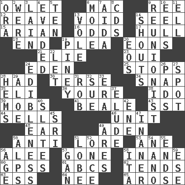 ACROSS 1. A small or young owl 6. Big _ 9. Portuguese money of account (variant) 12. Rob, plunder, or pillage 13. State of nonexistence 14. Sew up the eyelids of hawks and falcons 15. Believer in; advocate of (suffix) 16. Likelihood 17. Frame or body of a ship 18. Conclude 19. Entreaty 20. Immeasurably long periods of time 21. Writer Wiesel 23. Fr. "Yes" 24. Paradise 25. Constricts 28. Possessed 30. Laconic 34. Fastener 35. Biblical high priest 36. You are 38. Wedding promise 39. Disorderly crowds 41. Memphis, Tenn. Street 43. Fast jet (abbr.) 44. Exchanges for money 46. A single undivided whole 48. Ewer handle 49. Arabian gulf 50. Opposed to 51. Old wives' tales, e.g. 53. A saturated hydrocarbon 56. Toward shelter 57. Went 58. Silly 60. Global Positioning Systems (abbr.) 61. Lettered men learn these first 62. Looks after 63. Curvy letter 64. Born 65. Came up DOWN 1. Mouth or opening 2. We are 3. (Had) reclined 4. Eluded 5. "___ Little Indians" 6. Method 7. Opera by Verdi 8. Music discs 9. One who advocates reunion 10. Snakelike fish 11. Pipe bend 13. Short-tailed, large-bodied rat 14. Yells 19. Abounding in pines 20. Greek goddess of the dawn 22. Allow 24. The property of being fit to eat 26. Writing tablets 27. Blemish 28. Cloth borders 29. _ vera 31. Director Reiner 32. Institute legal proceedings 33. Epoch 37. Evade 40. Chalkboards 42. Compass dir. 45. Indian title of respect (Mr.) 47. More lacking in sense or substance 49. Ancient Greek god of war 50. High mountains 51. Ear part 52. At one time in the past 54. Billionth: prefix 55. Extremities 56. Ripen 57. Separate the seeds from cotton 58. Call ___ day 59. Compass dir.