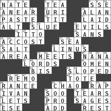 ACROSS 1. Nathan's nickname 5. Afternoon social gathering 8. Compass dir. 11. Approach 13. RI univ. 14. ____ Jay Lerner 15. Thick mixture 16. Teat (slang) 17. Put down 18. Keyboard modifier key 19. Change direction abruptly 21. Vices 22. "Tell ____ the Marines!" 24. Without 25. Buttonhole 27. Ocean 29. Table seasoning 30. "_ and Lucy" (Charlie Brown theme song) 32. Type of rug 33. Confronts 35. Nanny 39. Titled peers of a realm 41. Sign of something about to happen 42. Twice 43. Slanted 45. San ____ (Riviera town) 48. Carry 49. The wife of a rajah (variant) 50. US Secretary of Labor Elaine L. _ 52. Strike 55. _ the terrible 56. "Barney Miller" actor Jack 57. Lacerates 59. Allows 60. Adept person 61. Gurus 62. Compass dir. 63. Find the sum of 64. State of inaction DOWN 1. California wine valley 2. Of or related to the anus 3. A testis 4. Ingest 5. Ballerina skirt 6. One of the Great Lakes 7. Small island 8. Killed 9. Moves on water 10. Extremities 12. Musical pauses 14. Inventor's middle name 20. Car dealer's back yard 21. He sold his birthright 23. Add up to 25. White ___ sheet 26. Automobile 27. Be seated 28. Followers of ems 30. French article 31. Snob 33. Medical imaging device (abbr.) 34. Begley and Asner 36. Electrical Measurement 37. Born 38. Also 40. Mitch Miller's instrument 43. R.R. building 44. Plunders 45. All-night dance parties 46. Related on the mother's side 47. Not women's 49. Cause heat under the collar 50. Drawstring 51. Parka part 53. Ancient Greek god of war 54. Inconspicuous attention getter 56. Health resort 58. Ewer handle