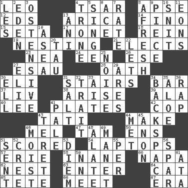 ACROSS 1. Lion 4. Russian ruler of old 8. Domed church section 12. Begley and Asner 13. N. Chile seaport 14. Fine (Spanish) 15. Bristle 17. Music written for nine 18. It's straight from the horse's mouth 19. Inhabiting a nest 21. Chooses 23. Teachers' org. 24. Car or cant ending 26. Compass dir. 27. Son of Isaac 28. Pledge 30. Connecticut Ivy Leaguer 31. Flight of steps 34. Tavern 37. 54 in ancient Rome 38. Get up 39. In the manner of 40. Area sheltered from the wind 41. Food holders 42. Police officer (slang) 43. Jacques of French films 44. Cause to be 46. Cartoonist voice _ Blanc 47. Scottish cap 50. Followers of ems 51. Tallied 54. Portable computers 57. One of the Great Lakes 58. Empty; void 60. California wine valley 62. A home for chicks 63. Keyboard key 64. Domesticated feline 65. False hair 66. Rendezvous 67. Period DOWN 1. French article 2. Genesis locale 3. Clearly or manifestly demonstrative 4. Marketplace scale 5. Scorch 6. Adept person 7. Assign a rank or rating to 8. Anew 9. Part 10. In a ____ (agitated or irritated) 11. Immeasurably long periods of time 13. Cuckoo 16. At sea 20. The 19th letter of the Greek alphabet 22. Allows 25. Annoying sound 27. Writer Wiesel 29. Ancient Greek god of war 30. Pipe bend 31. Table seasoning 32. Distinguishing feature 33. Small island 34. Keyboard key 35. Medicinal plant 36. Reproach for some lapse or misdeed 41. Diluted with white 43. Cylindrical with tapered ends 44. Was introduced to 45. At once, immediately (arch.) 46. Damp 48. Having winglike extensions 49. French painter Edouard 51. Emitted 52. Algonquian 53. South Vietnam president (1954) 55. For each 56. Coast Guard woman 59. Compass dir. 61. _ moment's notice (2 wds.)