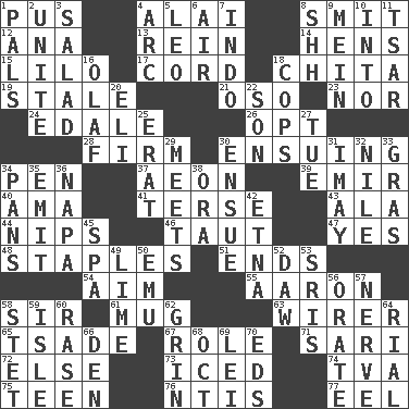 ACROSS 1. Suppuration 4. Jai ____ 8. Stricken, poetically 12. Santa ___, CA 13. It's straight from the horse's mouth 14. Coop moms 15. _ and Stitch 17. Drawstring 18. Riviera of "Kiss of the Spider Woman" 19. Showing deterioration from age 21. Bear (Spanish) 23. Not either 24. Peak District village in England 26. Choose 28. Not soft or yielding to pressure 30. Taking place subsequently 34. Writing instrument 37. Period of immesurable duration 39. Independent ruler or chieftain 40. Nursemaid (var.) 41. Laconic 43. Wing 44. Pinches, bites 46. Strained 47. Consenting reply 48. Paper fasteners 51. Extremities 54. Direct toward a target or goal 55. Composer Copland 58. Title for a knight 61. Large cup 63. One who wires 65. Sadhe (variant) 67. Hero or heavy, e.g. 71. Indian skirt 72. Otherwise 73. On the rocks 74. Federal power corp. 75. Adolescent 76. Nuclear Threat Initiatives 77. Snakelike fish DOWN 1. Friends 2. Join together 3. First course 4. Curve 5. Lion 6. Atmosphere 7. Southeast Asian peninsula 8. Quiet! 9. Count _ (2 wds.) 10. To the inside or interior of 11. Russian ruler of old 16. Norwegian king 18. 911 reaches them 20. Biblical high priest 22. Manchild 25. Part of Q.E.F. 27. Third day of the wk. 29. Confronts 30. Take place subsequently 31. "If ____ say so..." 32. Mediterranean tributary 33. Pate de foie ____ 34. Baking dishes 35. Send forth 36. California wine valley 38. Mouth or opening 42. Inactive volcano in Sicily 45. Health resort 49. Citrus frut 50. Australian flightless bird 52. Obsolete 53. Indian titles of respect 56. Declaim 57. Boldness 58. Proofreading order 59. Small island 60. To erase 62. Smile widely 64. Monetary unit of Yemen 66. Lair 68. Sep. follower 69. Flowery wreath 70. Begley and Asner