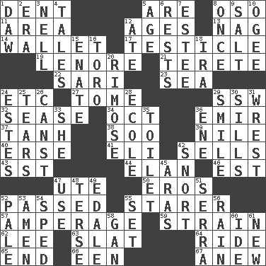 ACROSS 1. Incision 5. "We ___ not amused" (Victoria) 8. Bear (Spanish) 11. Type of rug 12. Eons 13. Tired old horse 14. Place for singles 17. A testis 19. Poe poem 21. Cigar-shaped 22. Indian skirt 23. Ocean 24. And so on (abbr.) 27. Heavy book 29. Compass dir. 32. Gospel singer Marvin 34. Sep. follower 36. Arab leader 37. Hyperbolic tangent 38. "Barney Miller" actor Jack 39. The longest river in the world 40. Celtic language 41. Biblical high priest 42. Makes a sale 43. Fast jet (abbr.) 44. Style 46. Eastern Standard Time (abbr.) 47. Shoshoni 50. Greek god of love 52. Went by 55. A viewer who gazes fixedly 57. Electrical Measurement 59. Put through a sieve 62. Area sheltered from the wind 63. Narrow board 64. Travel on an animal 65. Conclusion 66. Car or cant ending 67. Afresh DOWN 1. Simpleton 2. Epoch 3. 1994 drama film starring Jodie Foster 4. Stories 5. Mature 6. Musical pauses 7. First name in cosmetics 8. Single time 9. Table seasoning 10. Double curve, resembling the letter S 12. Had dinner 15. Maternal 16. "Corrida" creature 18. Lyricist Gershwin 20. Full of chinks, cracks, or crevices 24. _____ Park, CO 25. Pulls apart 26. 2nd pers. sing. pres. of can (arch.) 28. Learning spot: Fr. 29. Grin 30. Beverly of Met fame 31. Take or capture by force 33. A female animal or person 35. Bathroom 36. Compass dir. 42. Derisive sound 45. Ancient river in northeast Turkey 47. Purpose 48. Laconic 49. Peak District village in England 51. Father Junipero _ 52. Diluted with white 53. So be it 54. Hurried 55. Put into a specified state 56. Water falling in drops from the sky 58. Separate the seeds from cotton 60. Binary compound 61. ___ Haven, CT