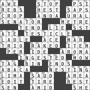ACROSS 1. Deep reverence 4. Discontinue 8. 23rd letter of the Greek alphabet 11. Confederate soldiers (slang) 13. Command 14. Plant excrements 15. Riding implement 16. Small Philippine buffalo 17. Mountain range 18. Legislator 21. Distance measurement (Brit.) 22. Be inclined (to) 23. Whopper 25. Fast jet (abbr.) 26. Had dinner 29. One of the two male reproductive glands 32. Dipping utensil 34. Adept person 35. Third mo. 38. Musical group of three 39. Swept the length of 41. A distinct part 43. For each 44. Binary compound 45. Scent 46. Consumed 50. Cut the grass 51. Label 54. Storage container 55. Conclusions 57. Phillipine bananalike plant 59. Nestling 63. Pale green bean 64. Saudi Arabian king (1953-1964) 67. Type of rug 68. Prepare for publication 69. Hoop that covers a wheel 70. Take ten 71. Elected rep. 72. Among 73. A female animal or person DOWN 1. Curves 2. Past tense of be (plural) 3. Inky black, to poets 4. Broken pieces 5. "___ Little Indians" 6. Bear (Spanish) 7. Parent Teacher Assoc. 8. Components 9. Practice fights 10. Small island 12. Petty quarrel 14. Take to court 19. False hair 20. Single 21. Cartoonist voice _ Blanc 23. Louse (plural) 24. On the rocks 26. Keyboard modifier key 27. Canvas cover 28. Singer Brickell 30. Proceeds 31. Arab leader 33. Australian parrot (variant) 36. Tiny particle 37. San ____ (Riviera town) 39. Swiss mountan, "Queen of the Mountains" 40. Arabian gulf 42. Opening into something insatiable 45. Sums up 47. Basketball assoc. 48. Watched over 49. Compass dir. 51. Lies 52. Stay 53. Homeless child 56. Play the lead 58. Domesticated feline 60. Angers 61. Soft 62. Yard entry 64. R.R. building 65. Direct toward a target or goal 66. RI univ.