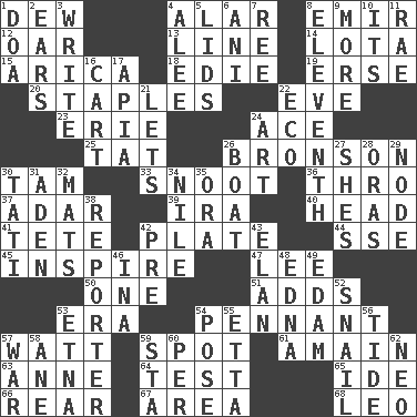 ACROSS 1. Morning condensation 4. Having or resembling wings 8. Arab leader 12. Boat paddle 13. Actor's bit 14. Globular water bottle used in Asia 15. N. Chile seaport 18. Singer Brickell 19. Celtic language 20. Paper fasteners 22. First lady 23. 4th largest of the Great Lakes 24. Adept person 25. Make lace 26. "Death Wish" actor 30. Scottish cap 33. Snout, nose 36. Through, poetically 37. The sixth month of the Jewish calendar 39. Lyricist Gershwin 40. Froth on beer 41. Wig 42. Food holder 44. Compass dir. 45. Heighten or intensify 47. Area sheltered from the wind 50. Single 51. Does sums 53. Period 54. Pre-World Series prize 57. Electrical Unit 59. Specific locale 61. With great haste 63. Singer Murray 64. Trial 65. Binary compound 66. Located in or toward the back 67. Type of rug 68. Lion DOWN 1. ___ good deed 2. Hearing organs 3. Compose 4. Toward shelter 5. Hats (slang) 6. Black tropical American cuckoo 7. To separate or throw off 8. Veterans Day date 9. Greater amount 10. ___ a Wonderful Life 11. Actress Charlotte 16. Heavy open wagon 17. Capital of Western Samoa 21. Allows 22. Environmental prefix 24. Nonscientific branch of learning 26. Water vessel 27. "______ My Girl" (Turtles hit) 28. Mouths or openings 29. Thickened enlargement 30. Jacques of French films 31. An important port of Yemen 32. Floor coverings 34. The longest river in the world 35. Mouth or opening 38. Newsperson 42. Before (prefix) 43. Style 46. _ tizzy (2 wds.) 48. Pulitzer Prize-winning author Ferber 49. Dutch treat 52. Slow-paced one 53. Inactive volcano in Sicily 54. Airs 55. Singer James 56. Periodic rise and fall of the sea level 57. Armed conflict 58. One (Scot) 59. R.R. building 60. For each 62. Modern: prefix