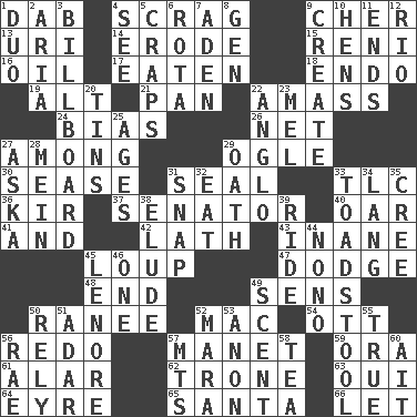 ACROSS 1. Small moist lump or mass 4. Strangle with an iron collar 9. "Mermaids" star 13. RI univ. 14. Wear away 15. Painter Guido (1575-1642) 16. Lubricate 17. Ingested 18. Inside; within (prefix) 19. Keyboard modifier key 21. Baking dish 22. Collect or gather 24. Prejudice 26. Fish or hair follower 27. Amid 29. Stare 30. Gospel singer Marvin 31. Lick closed 33. Affectionate concern, for short 36. Apertif with cassis 37. Elected representative 40. Rowing implement 41. Plus 42. Thin strip of wood or metal 43. Empty; void 45. Central Nebraska county 47. Evade 48. Conclude 49. Elected reps. 50. Indian princess (variant) 52. Apple computer (short form) 54. Baseball player Mel 56. Redecorate 57. French painter Edouard 59. Mouth or opening 61. Having or resembling wings 62. Heavy duty weighing machine 63. Fr. "Yes" 64. Jane of fiction 65. Before Barbara or Clara 66. Allow DOWN 1. Superhero pair 2. Roberta Peters solo 3. Big road sign 4. Perceive with the eye 5. Dice game 6. Round or rotation of duties 7. Arabian gulf 8. Commissioned military rank (abbr.) 9. Cause to be 10. Coop moms 11. Conclusions 12. River (Sp.) 20. Canisters 22. White American of non-Hispanic descent 23. Cartoonist voice _ Blanc 25. Ripens 27. "____ silly question..." 28. Count _ (2 wds.) 29. Pledge 31. Fastener 32. Consume 33. Inedible or poisonous agaric 34. Austrian-born American filmmaker Fritz 35. Algonquian 38. Dodge 39. Travel on or in a vehicle 44. Words to Nanette 45. Poe poem 46. Single 49. Odor 50. Trust 51. The sixth month of the Jewish calendar 52. Hindu Mythology: god of death 53. Soon (poet.) 55. Loyal 56. Actress Charlotte 57. Mountains (abbr.) 58. Beverage made from leaves 60. Small island