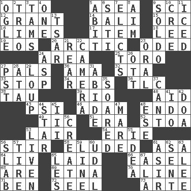 ACROSS 1. "Beetle Bailey" pooch 5. Toward the sea 9. _-fi 12. Monetary aid 14. Indonesian resort city 15. The grampus (Milton) 16. Citrus fruits 17. A distinct part 18. Area sheltered from the wind 19. Greek goddess of the dawn 20. Northern region 23. Wrote a lyric poem 24. Length times width 25. "Corrida" creature 27. Friends 30. Nursemaid (var.) 32. R.R. building 33. Constrict 34. Confederate soldiers (slang) 36. Affectionate concern, for short 38. The 19th letter of the Greek alphabet 39. River (Sp.) 40. Help 43. 23rd letter of the Greek alphabet 46. First man 48. Inside; within (prefix) 49. Nervous spasm 51. Epoch 52. Portico 53. Den 54. 4th largest of the Great Lakes 56. Disorderly outburst 58. Evaded 61. White ___ sheet 64. 54 in ancient Rome 65. Put down 66. Artist's stand 68. "We ___ not amused" (Victoria) 69. Inactive volcano in Sicily 70. Place in a line 71. Benjamin's nick name 72. Sew up the eyelids of hawks and falcons 73. Johnson of "Laugh-In" DOWN 1. Stare 2. Musical group of three 3. Scottish caps 4. Single 5. "This won't hurt ____!" 6. Suttee (variant) 7. Opts 8. Direct toward a target or goal 9. Twentieth part of a lira 10. Algonquian 11. On the rocks 13. Russian ruler of old 21. Posterior 22. Device for capturing images 23. Spoken 24. Cleo's killer 26. Baseball player Mel 27. Pacific Standard Time (abbr.) 28. "One Day ___ Time" 29. Central Nebraska county 31. Tolerate 35. Flew 37. Patter 41. Wedding promise 42. ___ good deed 44. Play the lead 45. One more than two 47. Female horse 48. Compass dir. 50. Make 53. Make or become more lively 55. The content of cognition 56. Thick slice 57. Hoop that covers a wheel 59. Actor's bit 60. Allodial 61. SW Saudi Arabia district 62. Posted 63. Toward shelter 65. French article 67. Insect wing