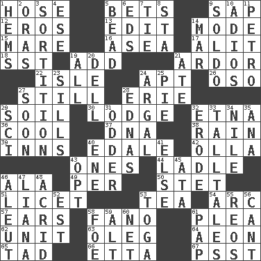 ACROSS 1. Flexible conduit 5. Wagers 9. Plant excrement 12. Greek god of love 13. Prepare for publication 14. Method 15. Female horse 16. Toward the sea 17. Came down and settled, as after flight 18. Fast jet (abbr.) 19. Increase 21. Zeal 22. Capri or Wight 24. Fitting 26. Bear (Spanish) 27. Not moving 28. 4th largest of the Great Lakes 29. Earth 30. Cabin 32. Inactive volcano in Sicily 36. Calm and collected 37. Heredity factor (abbr.) 38. Water falling in drops from the sky 39. Taverns 40. Peak District village in England 42. Rounded earthenware pot or jar 43. Washington bills 44. Dipping utensil 46. Insect wing 49. For each 50. Proofreading order 51. It is permitted: Lat. 53. Afternoon social gathering 54. Curve 57. Hearing organs 58. Papal veil 61. Entreaty 62. A single undivided whole 63. Cassini of fashion 64. Age 65. Small boy 66. Singer James 67. Inconspicuous attention getter DOWN 1. Equivocates 2. Mouths or openings 3. Decision 4. Compass dir. 5. Necklace unit 6. Begley and Asner 7. Neckwear 8. R.R. building 9. Twentieth part of a lira 10. Goodbye (Sp.) 11. Stone: prefix 14. Make imperfect 19. 100% 20. Small valley 21. Had dinner 23. Beverly of Met fame 24. Therefore, facetiously 25. Sliced dessert 27. Within a short period 28. Ferber et al. 29. _-fi 31. More peculiar 32. Eat (away) 33. Baron Munchausen's specialties 34. Mediterranean tributary 35. Santa ___, CA 40. Compass dir. 41. Otherwise 43. Elect 45. "One Day ___ Time" 46. Eskimo relative 47. Climbing, woody, usually tropical vines 48. Sour-tasting 52. Eastern Standard Time (abbr.) 53. Ancient Roman robe 55. Vintage cars 56. Patter 58. Enemy 59. The first octave above the treble staff 60. Fish or hair follower 61. Infant food