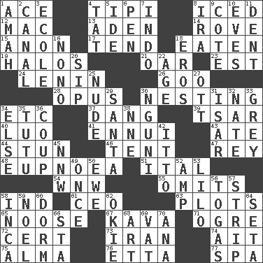 ACROSS 1. Adept person 4. Native american tent (variation) 8. On the rocks 12. Big _ 13. Arabian gulf 14. Be footloose 15. At once, immediately (arch.) 17. Watch over 18. Consumed 19. Saint headwear 21. Boat paddle 23. Eastern Standard Time (abbr.) 24. Soviet premier 1918-24 26. Thick or sticky substance 28. Musical composition 30. Nestling 34. And so on (abbr.) 37. Mild oath, euphamism for damn 39. Russian ruler of old 40. Nilotic language 41. World-weariness 43. Had dinner 44. Surprise greatly 46. Portable shelter 47. Marina Del _, California 48. Normal relaxed breathing 51. Slanted text style (abbr.) 54. Compass dir. 55. Leaves out 58. Working for oneself (abbr.) 61. Corporate head (abbr.) 63. Secret plans 65. Trap for birds or small mammals 67. Polynesian shrub of the pepper family 71. Legendary monster 72. Foregone conclusion 73. SW Asia republic 74. Small island 75. _ mater 76. Singer James 77. Health resort DOWN 1. Housemaid 2. Lessep's creation 3. Learning spot: Fr. 4. Make lace 5. Binary compound 6. Animal enclosure 7. _ china 8. Retirement account (abbr.) 9. ____ d'Azur (French Riviera) 10. Nights before holidays 11. Incision 16. Words to Nanette 18. Greek god of love 20. Small drink 22. Mature 25. Unadorned 27. Baseball player Mel 29. Before Barbara or Clara 30. Group of southern Bantu languages 31. Austrian river, tributary to the Danube 32. Nathan's nickname 33. Jennifer or Joel 34. Otherwise 35. Ballerina skirt 36. Clever action or accomplishment 38. Compass dir. 42. "Tell ____ the Marines!" 45. Compass dir. 49. At one time in the past 50. She-sheep 52. Electrical Unit 53. _ and Stitch 56. Ancient Roman robes 57. Empty completely 58. South American Indian 59. Christmas carol 60. Dormintory (informal) 62. Migrant worker of the '30s 64. Stalk of a moss capsule 66. R.R. building 68. Tate display 69. Large container 70. Santa ___, CA