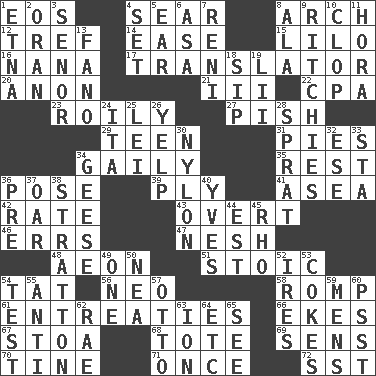 ACROSS 1. Greek goddess of the dawn 4. Burn superficially 8. Bowlike part 12. Not kosher 14. Comfort 15. _ and Stitch 16. Grandmother 17. Interpreter 20. Soon (poet.) 21. One more than two 22. Tax preparer (abbr.) 23. Agitated, as a liquid 27. Expression of disdain 29. Adolescent 31. Sliced desserts 34. Lightheartedly 35. Repose 36. Introduce or present, as a question 39. Travel a route regularly 41. Toward the sea 42. Assign a rank or rating to 43. Unconcealed 46. Blunders 47. Delicate 48. Period of immesurable duration 51. Unemotional 54. Make lace 56. Modern: prefix 58. Play 61. Pleas 66. Supplements with great effort 67. Portico 68. Haul 69. Elected reps. 70. Prong on a fork 71. Single time 72. Fast jet (abbr.) DOWN 1. Inactive volcano in Sicily 2. Northwest Algerian city 3. Sir (Sp.) 4. Arrange properly for use 5. Ewer handle 6. White ___ sheet 7. Painter Guido (1575-1642) 8. Insect wing 9. Actors Guy, Robert Welles, and Clint 10. Hoof sound 11. Israeli folk dance 13. Papal veil 18. Small drink 19. Cards in a Roman deck? 24. Call ___ day 25. Luau accessory 26. Sharp bark 28. Small fatty European fish 30. Thermoplastic polyamide 32. Compass dir. 33. R.R. building 34. Honkers 36. Before (prefix) 37. Rowing implement 38. Ski resort town in Vermont 40. Jacques Cousteau's middle name 44. Eastern Standard Time (abbr.) 45. 17th letter of the Greek alphabet 49. Single 50. Teachers' org. 52. Angers 53. Popular sodas 54. Trial 55. Against 57. "Beetle Bailey" pooch 59. Not women's 60. Inconspicuous attention getter 62. Actress Charlotte 63. Electrically charged atom 64. And so on (abbr.) 65. Observe