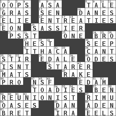 ACROSS 1. I made a mistake 5. White ___ sheet 8. Lie 12. Pate de foie ____ 13. Elected rep. 14. Natives or inhabitants of Denmark 15. Writer Wiesel 16. Pleas 19. Age 20. More impudent 21. Inconspicuous attention getter 23. Single 24. Sis' sibling 27. Behest 30. Ooze 31. New York city 34. Patter 35. Move through with a circular motion 38. Peak District village in England 40. Lyric poems 41. Is not 42. A viewer who gazes fixedly 44. Floor coverings 45. Immoral or dissolute person 46. Adept person 47. Overdraft (abbr.) 50. Dutch treat 53. Sycophants 57. Benjamin's nick name 59. One who advocates reunion 63. Tall New Zealand timber tree 64. Fertile tracts in a desert 65. One of the 12 tribes of Israel 66. An important port of Yemen 67. Cy Young winner Saberhagen 68. Retirement account (abbr.) 69. Snakelike fish DOWN 1. Double curve, resembling the letter S 2. Lowest deck of a ship 3. Aches 4. Compass dir. 5. Toward the sea 6. Elected reps. 7. Pismires 8. Make lace 9. Cuckoo 10. Area sheltered from the wind 11. Double-curved letter 14. Have the gumption 17. River (Sp.) 18. Car or cant ending 20. Proofreading order 22. Upper-body garments 24. Necklace unit 25. French philosopher Descartes 26. Chooses 28. A female animal or person 29. Bits 30. Tallied 32. Feline 33. Having or resembling wings 35. Simple or foolish person 36. Russian ruler of old 37. To the inside or interior of 39. Epoch 43. Makes supply last 47. Nuclear Threat Initiatives 48. "Barney Miller" actor Jack 49. Air blower 51. Tolerate 52. Klaipeda city 54. "You Light Up My Life" star Conn 55. Austrian river, tributary to the Danube 56. Inactive volcano in Sicily 58. Religious women 59. Director Reiner 60. Hearing organ 61. Purpose 62. Remaining after all deductions 63. Actress Charlotte