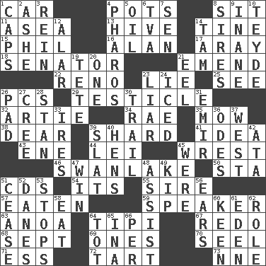ACROSS 1. Auto 4. Plant holders 8. Be seated 11. At sea 13. Hub of activity 14. Prong on a fork 15. Silvers or Donahue 16. Actor Alda or Thicke 17. Like ___ of sunshine 18. Legislator 21. Make improvements or corrections to 22. Western Nevada city 23. Falsehood 25. Observe 26. Personal Computers (abbr.) 29. One of the two male reproductive glands 32. Nick name for Arthur 34. Actress Charlotte 35. Cut the grass 38. Letter starter 39. Pottery fragment 41. The content of cognition 43. Compass dir. 44. Luau accessory 45. Obtain by seizing forcibly or violently 46. Tchaikovsky ballet 50. R.R. building 51. Music discs 54. ___ a Wonderful Life 55. Title for a man of rank and authority 57. Ingested 59. Orator 63. Small Philippine buffalo 64. Native american tent (variation) 67. Do over again 68. Back-to-school mo. 69. Singles 70. Stitch closed the eyes of (a falcon) 71. Curvy letter 72. Small pie 73. Compass dir. DOWN 1. Smile enhancers 2. American tennis player Robert 3. It's straight from the horse's mouth 4. N Egypt peninsula 5. Petroleum 6. Federal power corp. 7. Elected rep. 8. Begets 9. Lacking in sense or substance 10. Miss Universe 1986, Barbara Palacios _ 12. Having or resembling wings 14. Scottish cap 19. False hair 20. Single 21. Snakelike fish 23. One who doesn't tell the truth 24. On the rocks 26. Writing tablet 27. Algonquian 28. Comedian Laurel of Laurel & Hardy 30. Drop behind 31. Arab leader 33. Angers 36. Lyric poems 37. Compass direction 39. Narrow board 40. Coop moms 42. "One Day ___ Time" 45. Past tense of be (plural) 47. Victory 48. Aid 49. Monetary unit of Laos 51. Desist 52. Natives or inhabitants of Denmark 53. Constricts 56. Hearing organs 58. Erode 60. Peachy ____! 61. Locale of original sin 62. Hero or heavy, e.g. 64. Small child 65. _ tizzy (2 wds.) 66. For each