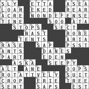 ACROSS 1. Mischievous 4. Singer James 8. Toward the sea 12. Rich soil 14. Made supply last 15. Tail end 16. Measure of real estate 17. Unrelated to defense, as in spending 20. Prong on a fork 21. "Barney Miller" actor Jack 22. _ moment's notice (2 wds.) 23. Constricts 27. Religious group 29. Political cartoonist Thomas 31. Loose flowing garment 34. Portable shelters 35. Roberta Peters solo 36. Raze (variant) 39. Plant excrement 41. Inconspicuous attention getter 42. Pismires 43. Natives or inhabitants of Denmark 46. Component 47. Paradise 48. "____ silly question..." 51. Oozy 54. Keyboard modifier key 56. A saturated hydrocarbon 58. I made a mistake 61. Happening in regular succession 66. Set of matching outer garments 67. Riding implement 68. One of the Great Lakes 69. Relationship diagram 70. Posted 71. Plant excrements 72. Eastern Standard Time (abbr.) DOWN 1. Narrow board 2. Event scenes 3. Entertaining tales 4. Car or cant ending 5. Ring climax 6. Nine, plus one 7. Sums up 8. "We ___ not amused" (Victoria) 9. Legislators 10. 90 degrees 11. Length times width 13. Rendezvous 18. Greek goddess of the dawn 19. Enemy 24. Single 25. Baking dish 26. Fast planes 28. Dice game 30. Sadhe (variant) 32. Altar cloth linen 33. Consume 34. Trials 36. Reproach for some lapse or misdeed 37. Santa ___, CA 38. Ski resort town in Vermont 40. Groovy apts. 44. Born 45. Compass dir. 49. Krazy ___ of comics 50. Cuckoo 52. Mail 53. You are 54. Arches 55. Old wives' tales, e.g. 57. Nights before holidays 59. Sliced desserts 60. Proofreading order 62. Fitting 63. Epoch 64. Mouth edge 65. Consenting reply