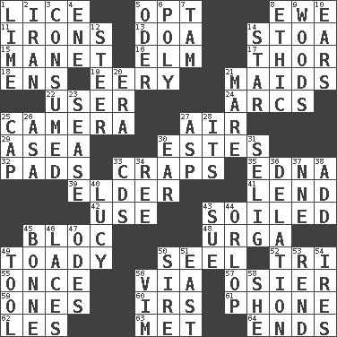 ACROSS 1. Louse (plural) 5. Elect 8. She-sheep 11. Removes the wrinkles 13. ___ good deed 14. Portico 15. French painter Edouard 16. Shade tree 17. Son of Odin 18. Followers of ems 19. Suggestive of the supernatural 21. Women servants 22. One who makes use of a thing 24. Arches 25. Device for capturing images 27. Wind 29. Toward the sea 30. _____ Park, CO 32. Writing tablets 33. Dice game 35. Pulitzer Prize-winning author Ferber 39. A person who is older than you are 41. Grant temporary use of 42. Purpose 43. Dirtied 45. Coalition 48. Capital and largest city of Mongolia 49. Sycophant 50. Sew up the eyelids of hawks and falcons 52. Three (prefix) 55. At one time in the past 56. By way of 57. Flexible twig of a willow tree 59. Washington bills 60. Big collection agency 61. Give a jingle 62. French article 63. Was introduced to 64. Conclusions DOWN 1. Citrus frut 2. SW Asia republic 3. Eaten 4. Compass dir. 5. Baltic tributary 6. More than one (prefix) 7. Scottish cap 8. Moral principle 9. Forest 10. Hearing organs 12. Bull 14. Play the lead 20. Epoch 21. Female horse 23. Gospel singer Marvin 25. Head covering 26. White ___ sheet 27. Viper 28. It is 30. Hearing organ 31. Former Milwaukee Brewers owner Bud 33. Music discs 34. Portuguese money of account (variant) 36. Accusation by an informer 37. Compass dir. 38. Find the sum of 40. "I Love _" 43. Take to court 44. Fourth or lowest deck 45. Maid-servant 46. Shoestrings 47. Lyric poems 49. Implement 50. The founder of a family 51. 90 degrees 53. Tear apart 54. Angers 56. Zeal 58. A female animal or person