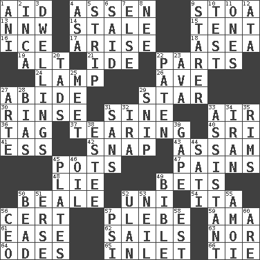 ACROSS 1. Help 4. NE Netherlands city 9. Portico 13. Compass dir. 14. Showing deterioration from age 15. Portable shelter 16. Frozen water 17. Ascend 18. Toward the sea 19. The first octave above the treble staff 21. Binary compound 22. Components 24. Desk light 26. "___ Maria" 27. Remain 29. Play the lead 30. Wash lightly 31. Trig term 33. Wind 36. Label 37. Rending 40. Indian title of respect (Mr.) 41. Curvy letter 42. Fastener 43. Indian state 45. Plant holders 47. Aches 48. Whopper 49. Stakes 50. Calif. Air Force Base 52. University (slang) 54. Call ___ day 56. Foregone conclusion 57. Cadet 59. Housemaid (var.) 61. Comfort 62. Moves on water 63. And not 64. Lyric poems 65. An arm off of a larger body of water 66. Standoff DOWN 1. Black tropical American cuckoo 2. South American Indian 3. Residences 4. White ___ sheet 5. Empty completely 6. Alleged 7. Otherwise 8. Born 9. A viewer who gazes fixedly 10. Trial 11. Washington bills 12. "One Day ___ Time" 20. Small amounts or degrees 22. Eucharist need 23. Actress Gardner 25. Confront 27. Johnson of "Laugh-In" 28. Prejudice 29. Clip 31. Without 32. Lyricist Gershwin 33. Aide 34. SW Asia republic 35. Basketball hoops 38. First name in cosmetics 39. Yawn 44. Suttee (variant) 45. Food holders 46. Lubricate 49. Instruction Manual for Humans 50. Necklace unit 51. Celtic language 52. ____ Bator, Mongolia 53. Famous astronaut Armstrong 55. Mine, in Marseilles 56. Corporate head (abbr.) 57. 23rd letter of the Greek alphabet 58. Eastern Standard Time (abbr.) 60. "We ___ not amused" (Victoria)