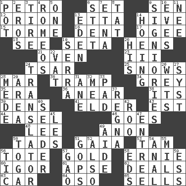 ACROSS 1. Stone: prefix 6. Arrange properly for use 9. Elected rep. 12. Constellation of myth 13. Singer James 14. Hub of activity 15. Singer Mel 16. Scratch 17. Double curve, resembling the letter S 18. Observe 19. Stalk of a moss capsule 20. Coop moms 21. Baking chamber 23. One more than two 24. Russian ruler of old 25. Overwhelms 28. Make imperfect 30. _____ steamer (cargo ship) 34. Jennifer or Joel 35. Epoch 36. Approach 38. ___ a Wonderful Life 39. Lairs 41. A person who is older than you are 43. Eastern Standard Time (abbr.) 44. Artist's stand 46. Leaves 48. Area sheltered from the wind 49. At once, immediately (arch.) 50. Small amounts or degrees 51. Greek goddess of the earth (variant) 53. Scottish cap 56. Carry 57. Gilded 58. Bert's buddy 60. Russian composer Stravinsky 61. Domed church section 62. Allots cards 63. 4-wheeled motor vehicle 64. Bear (Spanish) 65. Makes a sale DOWN 1. Cooking vessel 2. Greek god of love 3. Become fatigued 4. Lover boys 5. Single 6. Proofreading order 7. Inactive volcano in Sicily 8. Make lace 9. Seigniories (variant) 10. Nights before holidays 11. Born 13. Paradise 14. Cultivating 19. Father Junipero _ 20. Part of HMS, perhaps 22. Large container 24. Interpreter 26. Moistens 27. System (abbr.) 28. Ancient Persian 29. Type of rug 31. One (Scot) 32. Cartoonist voice _ Blanc 33. Writing tablet 37. Rain (Swedish) 40. Sowing specialist 42. Friend of Pooh 45. French article 47. Main course 49. Helper 50. Ancient Roman robe 51. Republicans 52. In addition 54. Of or related to the anus 55. Place where flour is made 56. Nervous spasm 57. E Mali city 58. Begley and Asner 59. Double-curved letter