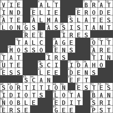 ACROSS 1. Compete 4. Keyboard modifier key 7. Naughty child 11. Indiana (abbr.) 12. Writer Wiesel 13. Wear away 14. Had dinner 15. _ mater 16. Chalkboards 17. Yearns 19. Helper 21. To separate or throw off 23. Angers 24. Baby powder 25. Personal question 26. Baseball player Mel 29. With motion or animation 30. Followers of ems 31. "We ___ not amused" (Victoria) 32. Make lace 33. Big collection agency 34. Metal container 35. Shoshoni 36. _-fi 37. Potato state 40. Double-curved letter 41. Area sheltered from the wind 42. Habitations of wild animals 43. Examine hastily 45. Newt 46. Making a chance decision by using lots 51. _____ Park, CO 55. Foolish or stupid persons 56. Globular water bottle used in Asia 58. Prohibit 59. Impressive in appearance 60. Prepare for publication 61. Indian title of respect (Mr.) 62. Celtic language 63. Unit of force equal to gravity 64. Pacific Standard Time (abbr.) DOWN 1. Small bottle 2. To the inside or interior of 3. Locale of original sin 4. 100% 5. Pale green bean 6. Afternoon social gatherings 7. Naughty children 8. Round or rotation of duties 9. Arabian gulf 10. Trial 12. Artist's stands 13. Otherwise 16. Founders of families 18. Pate de foie ____ 20. Public displays of written messages 22. Environmental prefix 24. Lugs 25. Nest on high 26. Curses 27. Musical group of three 28. Nine, plus one 29. Floor protectors 32. Third day of the wk. 33. Ancient Celtic tribe of eastern Britain 36. Narrow boards 37. Binary compound 38. Outscore 39. Pismires 43. Fur scarf 44. Quote 46. Trig term 47. Scent 48. Chest bones 49. Cassini of fashion 50. Connecting point 52. Cook's measure (abbr.) 53. Hearing organs 54. In a ____ (agitated or irritated) 57. Standoff