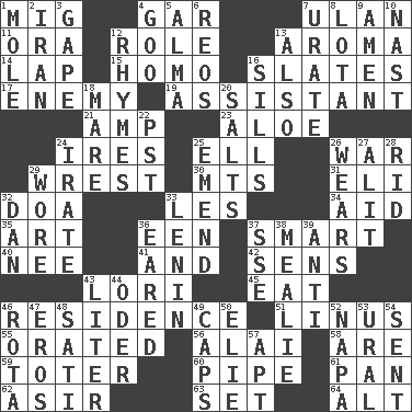 ACROSS 1. Russian fighter aircraft 4. Slender fish 7. ____ Bator 11. Mouth or opening 12. Hero or heavy, e.g. 13. Scent 14. Pet locale 15. Same (prefix) 16. Chalkboards 17. Foe 19. Aide 21. Electrical Unit 23. Medicinal plant 24. Angers 25. Pipe bend 26. Armed conflict 29. Obtain by seizing forcibly or violently 30. Mountains (abbr.) 31. Connecticut Ivy Leaguer 32. ___ good deed 33. French article 34. Help 35. Nonscientific branch of learning 36. Car or cant ending 37. Don Adams' spy role 40. Born 41. Also 42. Elected reps. 43. Australian parrot (variant) 45. Erode 46. Dwelling 51. "_ and Lucy" (Charlie Brown theme song) 55. Declaimed 56. Mountain range southwest of Kyrgyzstan 58. "We ___ not amused" (Victoria) 59. Carrier 60. Corncob 61. Baking dish 62. SW Saudi Arabia district 63. Put into a specified state 64. Keyboard modifier key DOWN 1. Undercover agent 2. SW Asia republic 3. Yawn 4. Thick or sticky substance 5. _ mater 6. Vintage cars 7. A salt of uric acid 8. Globular water bottle used in Asia 9. So be it 10. Political cartoonist Thomas 12. Poems 13. In addition 16. Beverly of Met fame 18. Female horse 20. Table seasonings 22. Pacific Standard Time (abbr.) 24. Feeling or showing extreme anger 25. Make improvements or corrections to 26. Puts on (as clothing) 27. Came down and settled, as after flight 28. To free from 29. Had on 32. Daniel's nick name 33. Soviet premier 1918-24 36. Having ears or earlike features 37. Compass dir. 38. Ear of corn 39. Opposed to 43. 61 cubic inches 44. Baltic tributary 46. Roll call or roster of names 47. Greek god of love 48. Suttee (variant) 49. Balmoral and tarboosh 50. Writer Wiesel 52. California wine valley 53. Mountain range 54. Transmitted 57. Fitting