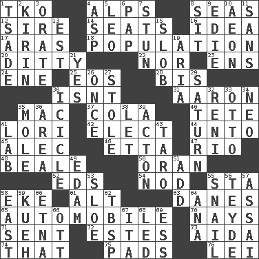 ACROSS 1. Ring climax 4. High mountains 8. Oceans 12. Beget 14. Theater features 16. It may be bright or harebrained 17. Caspian sea tributary 18. Census information 20. Simple song 22. And not 23. Followers of ems 24. Compass dir. 25. Greek goddess of the dawn 28. Twice 30. Is not 31. Composer Copland 35. Apple computer (short form) 37. Root beer relative 40. Wig 41. Australian parrot (variant) 42. Voters do this 44. To (old English) 45. Actor Baldwin 46. Singer James 47. _ de Janeiro 48. Calif. Air Force Base 50. Northwest Algerian city 52. Begley and Asner 54. Lower and raise head in agreement 55. R.R. building 58. Supplement with great effort 61. The first octave above the treble staff 63. Natives or inhabitants of Denmark 65. Car 70. Negative votes 71. Transmitted 72. _____ Park, CO 73. Opera by Verdi 74. Not this but _ 75. Groovy apts. 76. Luau accessory DOWN 1. Sadhe (variant) 2. Japanese brewing company 3. Declaim 4. Cleo's killer 5. Lion 6. Infant food 7. Astound 8. Be seated 9. Singer Brickell 10. Age 11. Without 13. Eastern Standard Time (abbr.) 15. Oscar Madison type 19. Operatic vocal solo 21. It is so 26. At one time in the past 27. Fur scarf 29. Titan orbits this 30. Hanging ice 32. Painter Guido (1575-1642) 33. Von Bismarck 34. Modern: prefix 35. Undercover agent 36. Length times width 38. Allow 39. Gambison 41. Experiment locale 43. Edible starchy tuberous root 49. Dutch treat 51. Increase 53. _ gin 55. Slow-paced one 56. Miss Universe 1986, Barbara Palacios _ 57. Slender Brazilian palm 58. 90 degrees 59. Malaysian steamed pastry 60. Inactive volcano in Sicily 62. Cook's measure (abbr.) 64. Santa ___, CA 66. Baseball player Mel 67. Call ___ day 68. Directed 69. Double-curved letter
