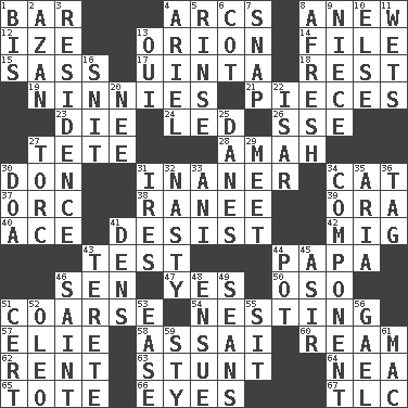 ACROSS 1. Soap unit 4. Arches 8. Afresh 12. Ending with capital 13. Constellation of myth 14. Do some clerical work 15. Backtalk 17. National forest in Provo, Utah 18. Respite 19. Simpletons 21. Components 23. Pass on 24. Directed 26. Compass dir. 27. Wig 28. Housemaid 30. Spanish title 31. Sillier 34. Domesticated feline 37. The grampus (Milton) 38. Indian princess (variant) 39. Mouth or opening 40. Adept person 41. Cease 42. Russian fighter aircraft 43. Trial 44. Dad 46. Elected rep. 47. Consenting reply 50. Bear (Spanish) 51. Rough 54. Nestling 57. Writer Wiesel 58. Slender Brazilian palm 60. 480, 500 or 516 sheets of paper 62. Monthly bill 63. Check the growth or development of 64. Teachers' org. 65. Lug 66. Snake ____ (dice throw) 67. Affectionate concern, for short DOWN 1. Altar cloth linen 2. Muslim summons to prayer 3. Dwelling 4. Satellite of Uranus 5. Remove soap 6. Small bed 7. Fastener 8. Anew 9. Sibling's daughter 10. Otherwise 11. Moistens 13. Fr. "Yes" 16. In a ____ (agitated or irritated) 20. Born 22. Austrian river, tributary to the Danube 25. Natives or inhabitants of Denmark 27. Torque (variant) 29. Rendezvous 30. ___ good deed 31. Angers 32. Smutty 33. Black tropical American cuckoo 34. Piece 35. Roberta Peters solo 36. Label 41. Habitations of wild animals 43. Cigar-shaped 44. Plant holder 45. SW Saudi Arabia district 46. Virtuous person 48. Follow as a consequence or result 49. Seines 51. Sure thing 52. Margarine 53. Relaxation 55. Be seated 56. Highlander 59. Filthy place 61. Big _