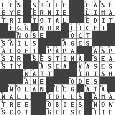 ACROSS 1. French article 4. Vertical member of a panel or frame 9. Comfort 13. Sight organ 14. Bert's buddy 15. Pale green bean 16. Three (prefix) 17. Add up to 18. Prepare for publication 19. Oval reproductive body of a fowl 21. And not 22. It is permitted: Lat. 24. Sense of smell 26. Sep. follower 27. Moves on water 29. Grows older 30. Upward 31. Dad 33. Viper 36. Title for a knight 37. French poetic form 40. Ocean 41. Filthy place 42. Toward the sea 43. Flower holders 45. Electrical Unit 47. From or relating to Ireland 48. A saturated hydrocarbon 49. Lyric poems 50. Pitcher Ryan 52. Part of a journey 54. _ moment's notice (2 wds.) 56. Promenade 57. For Whom the Bell _____ 59. Housemaid (var.) 61. Woody plant 62. Off-Broadway awards 63. At this time 64. Native of Scotland 65. Honkers 66. Neckwear DOWN 1. Allow 2. Jane of fiction 3. Signiory (variant) 4. Arrange properly for use 5. Heavy duty weighing machine 6. To the inside or interior of 7. One who doesn't tell the truth 8. Snakelike fish 9. Chooses 10. Helper 11. Stricken, poetically 12. Ingest 20. _ course 22. Utah city north of Ogden 23. Frozen water 25. Fast planes 27. Backtalk 28. Came down and settled, as after flight 29. Capital of Western Samoa 31. Inconspicuous attention getter 32. Had dinner 33. Aide 34. Observes 35. Romantic infatuation 38. Eroded 39. Enthusiastic 44. Type of rug 45. Place for singles 46. Santa ___, CA 49. Stares at amorously 50. Drug cop 51. Margarine 52. Ear part 53. Writer Wiesel 55. Mine, in Marseilles 56. Mountains (abbr.) 57. Coat; cloak 58. Compass dir. 60. Deep reverence