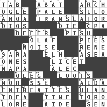 ACROSS 1. Keyboard key 4. Blind as ____ 8. Bowlike part 12. Stare 14. Light colored 15. Grain storage tower 16. Small Philippine buffalo 17. Interpreter 20. "Vaya con ____" 21. Pass on 22. Accounting whiz (abbr.) 23. Postpone 27. Expression of disdain 29. Norwegian king 31. Sliced desserts 34. Annoying sound 35. French philosopher Descartes 36. "Two Mules for Sister ____" 39. Shade tree 41. At sea 42. Washington bills 43. It is permitted: Lat. 46. California wine valley 47. Actor Baldwin 48. Cassini of fashion 51. Plunders 54. Not either 56. Compass dir. 58. Opera by Verdi 61. Pleas 66. ____ Bator, Mongolia 67. The main thing one is thinking about 68. Prong on a fork 69. "Corrida" creature 70. Old wives' tales, e.g. 71. Assistant 72. Elected rep. DOWN 1. Frog relative 2. Hindu god of fire 3. Vital fluid 4. Fitting 5. Tavern 6. In the manner of 7. Be inclined (to) 8. White ___ sheet 9. Actors Guy, Robert Welles, and Clint 10. Hoof sound 11. Israeli folk dance 13. Comfort 18. Small drink 19. Flowery wreath 24. Egg _ yung 25. Biblical high priest 26. To erase 28. Small fatty European fish 30. Chap (slang) 32. Compass dir. 33. Ocean 34. Rhinal 36. Male child 37. Santa ___, CA 38. News announcer 40. Place where flour is made 44. Corporate head (abbr.) 45. Environmental prefix 49. Compass dir. 50. Girls' org. (abbr.) 52. Tense 53. Grain storage towers 54. Famous astronaut Armstrong 55. Southwest Nigerian state 57. Singer James 59. Have the gumption 60. At once, immediately (arch.) 62. Actress Charlotte 63. One more than two 64. Conclusion 65. Observe