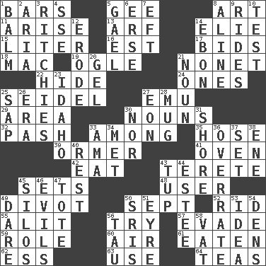 ACROSS 1. Soap units 5. Turn to the right 8. Nonscientific branch of learning 11. Ascend 13. Sandy's bark 14. Writer Wiesel 15. 61 cubic inches 16. Eastern Standard Time (abbr.) 17. Auction offers 18. Apple computer (short form) 19. Stare 21. Music written for nine 22. Flintstone garb 24. Singles 25. A glass for beer 27. Australian flightless bird 29. Type of rug 30. Parts of speech 32. Romantic infatuation 33. Amid 35. Stockings 39. Channel Islands abalone 41. Baking chamber 42. Ingest 43. Cigar-shaped 45. Puts into a specified state 48. One who uses or employs something 49. A piece of turf (Scot.) 50. Back-to-school mo. 52. To free from 55. Came down and settled, as after flight 56. Attempt 57. Elude 59. Hero or heavy, e.g. 60. Wind 61. Ingested 62. Curvy letter 63. Purpose 64. Afternoon social gatherings DOWN 1. Lip ointment 2. Roberta Peters solo 3. Actors Guy, Robert Welles, and Clint 4. Compass dir. 5. Highlander 6. Celtic language 7. Lizard (obsolete) 8. Place in a line 9. Amusement-park features 10. Trial 12. Eat (away) 14. Inky black, to poets 20. Set 21. Part of speech 23. Potato state 25. Plant excrement 26. Period 27. Age 28. Large cup 30. And not 31. Dinah or Pauly 33. Wet nurse (var.) 34. Was introduced to 36. Make much ado about nothing 37. Put into a specified state 38. Compass dir. 40. Relief 43. Uncastrated adult male sheep 44. First name in cosmetics 45. Grain storage towers 46. Vices 47. Carry 49. Have the gumption 50. Indian titles of respect 51. Jane of fiction 53. The main thing one is thinking about 54. Lairs 56. The 19th letter of the Greek alphabet 58. Large container