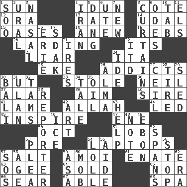 ACROSS 1. Player for Phoenix 4. Goddess of spring and wife of Bragi 8. ____ d'Azur (French Riviera) 12. Mouth or opening 13. Assign a rank or rating to 14. Freehold land 15. Fertile tracts in a desert 18. Afresh 19. Confederate soldiers (slang) 20. Preparing or cooking with lard 22. ___ a Wonderful Life 23. One who doesn't tell the truth 24. Call ___ day 25. Supplement with great effort 26. Inveterate users 30. On the contrary 33. Fur scarf 36. Famous astronaut Armstrong 37. Having or resembling wings 39. Direct toward a target or goal 40. Male parent of an animal 41. Unable to walk 42. Assad's deity 44. Directed 45. Motivate 47. Compass dir. 50. Sep. follower 51. Tennis shots 53. Before (prefix) 54. Portable computers 57. Table seasoning 59. Mine, in Marseilles 61. Maternal 63. Double curve, resembling the letter S 64. Disposed of to a purchaser 65. And not 66. Shrivel 67. Competent 68. Health resort DOWN 1. "Barney Miller" actor Jack 2. Mountain range 3. Rhinal 4. SW Asia republic 5. Mild oath, euphamism for damn 6. Shoshoni 7. ___ Haven, CT 8. Window treatments 9. Lyric poems 10. Bar bill 11. Raised railways 16. One of the Great Lakes 17. Neighbor of Neb. 21. Angers 22. It would 24. Binary compound 26. _ mater 27. To provide with a ceiling 28. Hoop that covers a wheel 29. Downhill vehicle 30. Indonesian resort city 31. Uhlan (variant) 32. Scottish caps 34. Story 35. Petroleum 38. News announcer 42. Nonscientific branch of learning 43. Aid 46. Frozen water 48. Musical sound 49. Inky black, to poets 52. Connects, as a bridge 53. Entreaty 54. Hang loosely or laxly 55. Assistant 56. Close up, plug up 57. Distress signal 58. Personal question 59. White ___ sheet 60. Disorderly crowd 62. Period