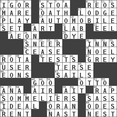 ACROSS 1. Russian composer Stravinsky 5. Portico 9. Vintage cars 13. Female horse 14. Pledge 15. Inn 16. Shaw product 17. Car 19. Arrange properly for use 20. Nonscientific branch of learning 21. Experiment locale 22. Snakelike fish 23. A really long time 25. Color 26. Scornful expression 30. Restaurants 34. Stop 35. Christmas carol 36. Roll call or roster of names 39. Trials 42. Jennifer or Joel 43. One who uses or employs something 44. Laconic 46. Immeasurably long periods of time 47. Moves on water 48. Thick or sticky substance 51. "Beetle Bailey" pooch 54. Santa ___, CA 57. Atmosphere 58. Small island 60. Reproach for some lapse or misdeed 62. Wine waiters 65. Backtalk 66. Standard of perfection 67. NW Algerian seaport 68. Lyric poems 69. Monthly bill 70. Political cartoonist Thomas 71. Egg locale DOWN 1. Naughty children 2. An organ shaped like a helmet 3. Declaim 4. Marina Del _, California 5. Fly high 6. Pulled tight 7. Baseball player Mel 8. Hold, grip (Informal) 9. Director Reiner 10. Singer Brickell 11. Stare 12. Stitch closed the eyes of (a falcon) 15. Ear part 18. Can I? 20. Queen of England 1702-14 24. Motion picture awards 27. Erode 28. Compass dir. 29. Musical pauses 30. Swallow 31. Not either 32. Born 33. Wily 36. Regret 37. Bear (Spanish) 38. "___ Little Indians" 40. Beverage made from leaves 41. Indian title of respect (Mr.) 45. Narrow, elongated depression 48. Highlander 49. Lubricate 50. Greek mythologigal hunter 52. Exchange 53. Fertile tracts in a desert 54. SW Saudi Arabia district 55. Thickened enlargement 56. So be it 58. Ancient river in northeast Turkey 59. Is not 61. Inconspicuous attention getter 63. Floor protector 64. Period 65. Male child