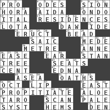 ACROSS 1. Adept person 4. Lyric poems 8. The Jewish people; Israel 12. Israeli folk dance 14. Opera by Verdi 15. Southwest Nigerian state 16. Slanted text style (abbr.) 17. Dwellings 20. Globular water bottle used in Asia 21. Simpleton 22. Binary compound 23. Spew [out] 27. Necklace unit 29. Ketch in the Levant 31. Ancient Persian 34. Distance measurement (Brit.) 35. Queen of England 1702-14 36. Relaxation 39. Ewer handle 41. Comedian Laurel of Laurel & Hardy 42. Woody plant 43. Theater features 46. Penny 47. Pulitzer Prize-winning author Ferber 48. Toward the sea 51. Profane or obscene expressions 54. Sep. follower 56. Mouth edge 58. 90 degrees 61. Appease 66. Medicinal plant 67. Pacific island yam 68. Examine minutely or intensely 69. Light colored 70. System (abbr.) 71. Cloth borders 72. Lair DOWN 1. Silvers or Donahue 2. Printing process, for short 3. Speak pompously 4. Rowing implement 5. Pass on 6. Begley and Asner 7. Expressed in words 8. Manchild 9. Event 10. Wrote a lyric poem 11. Characteristic smell of wine 13. Having or resembling wings 18. Apply (a substance) by light strokes 19. She-sheep 24. Purpose 25. Feline 26. Become fatigued 28. Collect or gather 30. Desist 32. Heredity factor (abbr.) 33. Car or cant ending 34. Confronts 36. And so on (abbr.) 37. "We ___ not amused" (Victoria) 38. Legislators 40. Do over again 44. Santa ___, CA 45. Make lace 49. Connecticut Ivy Leaguer 50. Small island 52. Pile 53. Vegetable dish 54. Elects 55. Supercomputer manufacturer 57. Expression of disdain 59. Flatfish 60. Adolescent 62. Plant holder 63. Adept person 64. Scottish cap 65. Followers of ems