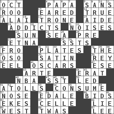 ACROSS 1. Sep. follower 4. Dad 8. Without 12. Friend of Pooh 13. Having ears or earlike features 14. Loyal 15. Mountain range southwest of Kyrgyzstan 17. Heavy duty weighing machine 18. Assistant 19. Inveterate users 21. Annoying sounds 23. Player for Phoenix 24. Ocean 26. Before (prefix) 27. Inactive volcano in Sicily 28. Fast planes 30. Back 31. Food holders 34. Definite Article 37. Bear (Spanish) 38. Smooth fabric 39. Marina Del _, California 40. Snakelike fish 41. Motion picture awards 42. Compass dir. 43. Johnson of "Laugh-In" 44. Part of Q.E.F. 46. Basketball assoc. 47. Fast jet (abbr.) 50. Directed 51. Ringlike coral islands and reefs 54. Ingest 57. Olfactory organ 58. Peak District village in England 60. Auction offers 62. Supplements with great effort 63. Cell (Danish) 64. Untruth 65. 270 degrees 66. It was, poetically 67. Area sheltered from the wind DOWN 1. Mouth or opening 2. Root beer relative 3. Inedible or poisonous agaric 4. Pieces 5. Came up 6. Fenced enclosure 7. An important port of Yemen 8. Flight of steps 9. Ascend 10. Naked 11. Observes 13. And so on (abbr.) 16. Goddess of spring and wife of Bragi 20. _ tizzy (2 wds.) 22. Chooses 25. Moving about 27. Celtic language 29. Elected reps. 30. Enemy 31. Inconspicuous attention getter 32. Shoestrings 33. _ moment's notice (2 wds.) 34. Excercise machine 35. Behest 36. Sight organ 41. Of the mouth 43. Most capable 44. Raised railways 45. Reuben's nickname 46. Olfactory organs 48. Any of the three canals of the cochlea 49. For Whom the Bell _____ 51. Afresh 52. Puff or smoke 53. Religious group 55. Born 56. Singer Brickell 59. Morning condensation 61. Observe