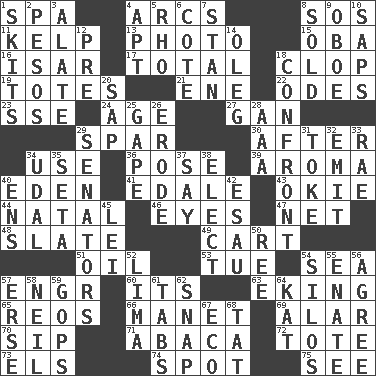 ACROSS 1. Health resort 4. Curves 8. Mayday 11. Seaweed 13. Picture 15. Chief or king in Benin or Nigeria 16. Austrian river, tributary to the Danube 17. "_____ Recall" 18. Hoof sound 19. Hauls 21. Compass dir. 22. Lyric poems 23. Compass dir. 24. Personal question 27. Separate the seeds from cotton 29. Practice fight 30. Following 34. Purpose 36. Introduce or present, as a question 39. Odor 40. Locale of original sin 41. Peak District village in England 43. Migrant worker of the '30s 44. Brizilian seaport 46. Snake ____ (dice throw) 47. Fish or hair follower 48. Chalkboard 49. Draw slowly or heavily 51. Lubricate 53. Third day of the wk. 54. Ocean 57. Engineer (abbr.) 60. It is 63. Supplementing with great effort 65. Vintage cars 66. French painter Edouard 69. Having or resembling wings 70. Small drink 71. Phillipine bananalike plant 72. Carry 73. Raised railways 74. Specific locale 75. Perceive with the eye DOWN 1. Burlesque acts 2. Mexican monetary units 3. Having winglike extensions 4. Fitting 5. 17th letter of the Greek alphabet 6. ____ d'Azur (French Riviera) 7. Comedian Laurel of Laurel & Hardy 8. Disposed of to a purchaser 9. Mitch Miller's instrument 10. Plant excrements 12. Before (prefix) 14. Cassini of fashion 18. Meet 20. Plant excrement 25. Open wide 26. Eat (away) 28. Auto club (abbr.) 29. Legislators 31. Puff or smoke 32. Send forth 33. Actress Charlotte 34. Freehold land 35. Stalk of a moss capsule 37. Declare 38. Opt 40. Followers of ems 42. He sold his birthright 45. Flowery wreath 50. To separate or throw off 52. Pale green bean 54. Grain storage towers 55. Maternal 56. Match 57. Celtic language 58. Famous astronaut Armstrong 59. Republicans 61. Bar bills 62. Fastener 64. Krazy ___ of comics 67. Environmental prefix 68. Make lace