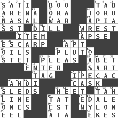 ACROSS 1. Suttee (variant) 5. Oct. 31 cry 8. Keyboard key 11. Sports stadium 13. Mouth or opening 14. "Corrida" creature 15. Rhinal 16. Armed conflict 17. Capital of Western Samoa 18. Fast jet (abbr.) 19. Deli pickle 21. Obtain by seizing forcibly or violently 22. A distinct part 24. Domed church section 25. Fortification 27. Fitting 29. Lubricates 30. Cartoon dog 32. Proofreading order 33. Entreaties 35. Collude with 39. Keyboard key 41. Indian skirt 42. Label 43. Medicinal drug used to evoke vomiting 45. Mine, in Marseilles 48. Keg 49. Bobsleighs 50. Rendezvous 52. Scottish cap 55. Citrus frut 56. Make lace 57. Peak District village in England 59. Washington bills 60. Eastern Standard Time (abbr.) 61. High-strength synthetic material 62. Snakelike fish 63. _ moment's notice (2 wds.) 64. Supplements with great effort DOWN 1. Without 2. Ancient river in northeast Turkey 3. A testis 4. _ tizzy (2 wds.) 5. Soup holder 6. Taken by mouth 7. Boat paddle 8. Drinks excessively 9. Get up 10. Water vessel 12. Tree or shrub in the Birch family 14. Canvas cover 20. Naughty child 21. Electrical Unit 23. Clothes sense 25. Greek goddess of the dawn 26. Be seated 27. In the manner of 28. Tenth month of the Hindu calendar 30. For each 31. Fertile tracts in a desert 33. Parent Teacher Association (abbr.) 34. Part of a journey 36. Sass 37. Period 38. Nervous spasm 40. Nuclear Threat Initiatives 43. Frozen water 44. Eucharist need 45. Place in a line 46. Klaipeda city 47. Lyric poems 49. A type of plum 50. Vertical spar for supporting sails 51. Singer James 53. _ vera 54. Not women's 56. Afternoon social gathering 58. Color