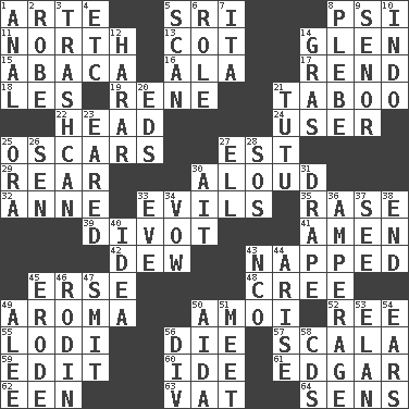 ACROSS 1. Johnson of "Laugh-In" 5. _ Lanka 8. Air pressure measure (abbr.) 11. _ pole 13. Small bed 14. Small, secluded valley 15. Phillipine bananalike plant 16. Wing 17. Tear apart 18. French article 19. French philosopher Descartes 21. Off limits 22. Froth on beer 24. One who makes use of a thing 25. Motion picture awards 27. Eastern Standard Time (abbr.) 29. Posterior 30. Verbally 32. Singer Murray 33. Vices 35. To erase 39. A piece of turf (Scot.) 41. So be it 42. Morning condensation 43. Slept 45. Celtic language 48. Algonquian 49. Scent 50. Mine, in Marseilles 52. To separate or throw off 55. Farming town in central California 56. Pass on 57. Any of the three canals of the cochlea 59. Prepare for publication 60. Binary compound 61. _ Allan Poe 62. Car or cant ending 63. Large container 64. Elected reps. DOWN 1. Of or related to the anus 2. Loose flowing garment 3. File 13 4. And so on (abbr.) 5. Skim 6. Hero or heavy, e.g. 7. Call ___ day 8. Military trainee 9. Sir (Sp.) 10. _ china 12. Ethiopian city, capital of Harari 14. Pate de foie ____ 20. Begley and Asner 21. Ballerina skirt 23. Having ears or earlike features 25. Mouth or opening 26. Elected rep. 27. Pipe bend 28. Distress signal 30. Small island 31. Window treatment 33. Night before a holiday 34. Promise 36. Electrical Measurement 37. Observe 38. Conclude 40. It may be bright or harebrained 43. Non-commissioned officer (abbr.) 44. Ascend 45. Wear away 46. "The Thinker" sculptor 47. Stricken, poetically 49. Toward shelter 50. Opera by Verdi 51. Rendezvous 53. Flair 54. Hearing organs 56. HTML Container Element 58. Music discs