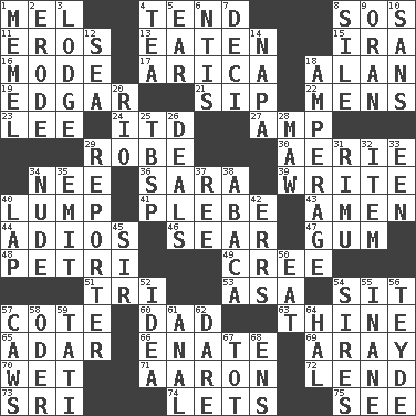 ACROSS 1. Cartoonist voice _ Blanc 4. Watch over 8. Distress signal 11. Greek god of love 13. Eroded 15. Lyricist Gershwin 16. Method 17. N. Chile seaport 18. ____ Jay Lerner 19. _ Allan Poe 21. Small drink 22. Not women's 23. Area sheltered from the wind 24. It would 27. Electrical Unit 29. Loose flowing garment 30. Nest on high 34. Born 36. "Two Mules for Sister ____" 39. Compose 40. Mass 41. Cadet 43. So be it 44. Goodbye (Sp.) 46. Burn superficially 47. Chewing product 48. _ dish (used to culture cells) 49. Algonquian 51. Three (prefix) 53. White ___ sheet 54. Be seated 57. ____ d'Azur (French Riviera) 60. June honoree 63. One or ones belonging to thee 65. The sixth month of the Jewish calendar 66. Maternal 69. Like ___ of sunshine 70. Dripping 71. Composer Copland 72. Grant temporary use of 73. Indian title of respect (Mr.) 74. Allows 75. Perceive with the eye DOWN 1. Klaipeda city 2. Wear away 3. Inn 4. Beverage made from leaves 5. Ewer handle 6. Nuclear Threat Initiatives 7. Tenth: prefix 8. Drop; flow; fall 9. NW Algerian seaport 10. Without 12. Ocean 14. California wine valley 18. Electrical Measurement 20. River (Sp.) 25. Cook's measure (abbr.) 26. Allots cards 28. Opening into something insatiable 29. News announcer 31. Tall New Zealand timber tree 32. A distinct part 33. Car or cant ending 34. Unadorned 35. Send forth 37. To sift 38. Phillipine bananalike plant 40. Infant locale 42. Blunders 45. Title for a knight 50. Erode 52. The main thing one is thinking about 54. Founders of families 55. Silly 56. Miss Universe 1986, Barbara Palacios _ 57. Crow sounds 58. Baltic tributary 59. Jacques of French films 61. Of or related to the anus 62. Have the gumption 64. Actor Linden 67. Small child 68. Followers of ems
