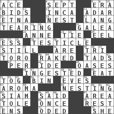 ACROSS 1. Adept person 4. Back-to-school mo. 8. Epoch 11. Auction offers 13. South American Indian 14. The sixth month of the Jewish calendar 15. Inactive volcano in Sicily 16. Egg locale 17. Long (Scottish) 18. Rending 21. An organ shaped like a helmet 22. Singer Murray 23. Make a knot 25. Snakelike fish 26. Double-curved letter 29. A testis 32. Not moving 34. "We ___ not amused" (Victoria) 35. Three (prefix) 38. "Corrida" creature 39. Moved through 41. Bits 43. For each 44. Binary compound 45. Fertile tracts in a desert 46. Swallowed 50. Ingest 51. Coat; cloak 54. Storage container 55. Nights before holidays 57. Scent 59. Snuggling 63. Thailand, formerly 64. Expressed in words 67. Length times width 68. Lacquered or enameled metalware 69. Single time 70. Remainder 71. Followers of ems 72. Wrote a lyric poem 73. A female animal or person DOWN 1. Collude with 2. Quote 3. Pulitzer Prize-winning author Ferber 4. Burns superficially 5. Compass dir. 6. Personal Computers (abbr.) 7. Make lace 8. Peak District village in England 9. The wife of a rajah (variant) 10. Therefore, facetiously 12. "Two Mules for Sister ____" 14. Chicken ___ king 19. International (abbr.) 20. Compass dir. 21. Set 23. Hoop that covers a wheel 24. On the rocks 26. Eastern Standard Time (abbr.) 27. Cease 28. Beget 30. Receives possession of 31. Singer James 33. Australian parrot (variant) 36. Raze (variant) 37. The content of cognition 39. Swiss mountan, "Queen of the Mountains" 40. Arabian gulf 42. Fast jet (abbr.) 45. Lyric poems 47. Basketball assoc. 48. Watched over 49. First lady 51. Clothes sense 52. Greek mythologigal hunter 53. Purposes of endeavors 56. Play the lead 58. Madame (abbr.) 60. Angers 61. Tender 62. Yard entry 64. "Barney Miller" actor Jack 65. Also 66. Frozen water