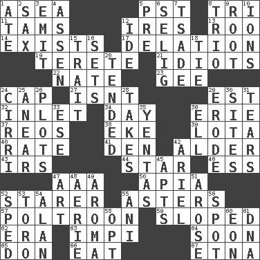 ACROSS 1. Toward the sea 5. Pacific Standard Time (abbr.) 8. Three (prefix) 11. Scottish caps 12. Angers 13. Friend of Pooh 14. Is 17. Accusation by an informer 19. Cylindrical with tapered ends 21. Foolish or stupid persons 22. Nathan's nickname 23. Unit of force equal to gravity 24. Head covering 27. Is not 29. Eastern Standard Time (abbr.) 32. An arm off of a larger body of water 34. 24 hours 36. 4th largest of the Great Lakes 37. Vintage cars 38. Supplement with great effort 39. Globular water bottle used in Asia 40. Assign a rank or rating to 41. Lair 42. Tree or shrub in the Birch family 43. Big collection agency 44. Play the lead 46. Double-curved letter 47. American Automobile Association (abbr.) 50. Capital of Western Samoa 52. A viewer who gazes fixedly 55. Michaelmas daisies 57. Characterized by complete cowardliness 59. Slanted 62. Epoch 63. Body of Kaffir warriors 64. Within a short period 65. Spanish title 66. Ingest 67. Inactive volcano in Sicily DOWN 1. Had dinner 2. Saxophone 3. Send forth 4. NE Netherlands city 5. Before (prefix) 6. Major League Baseball Commissioner Bud 7. Sadhe (variant) 8. Musical group of three 9. Carrot, for example 10. Charged atoms 12. Binary compound 15. Distinguishing feature 16. Puts into a specified state 18. Neckwear 20. Watched over 24. High-altitude cloud 25. Approach 26. Schemes 28. Receives possession of 29. Eat (away) 30. Settings 31. Rends 33. Compass dir. 35. Gossips 36. Pipe bend 42. Satellite of Uranus 45. Flats, for short 47. Nonscientific branch of learning 48. Nest on high 49. Scent 51. Came up 52. Hurried 53. "Corrida" creature 54. ____ Jay Lerner 55. Black tropical American cuckoo 56. Specific locale 58. Choose 60. Period of immesurable duration 61. Heredity factor (abbr.)
