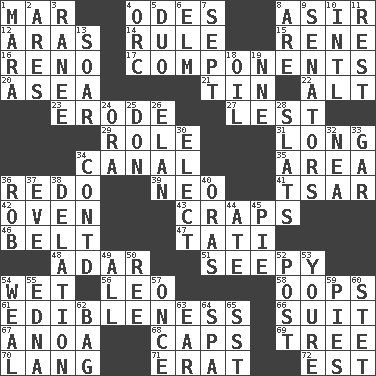 ACROSS 1. Impair 4. Lyric poems 8. SW Saudi Arabia district 12. Ancient river in northeast Turkey 14. Governing power 15. French philosopher Descartes 16. Western Nevada city 17. Pieces 20. Toward the sea 21. Metal container 22. Keyboard modifier key 23. Wear away 27. For fear that 29. Hero or heavy, e.g. 31. Yearn 34. Lessep's creation 35. Type of rug 36. Redecorate 39. Modern: prefix 41. Russian ruler of old 42. Baking chamber 43. Dice game 46. Waist strap 47. Jacques of French films 48. The sixth month of the Jewish calendar 51. Oozy 54. Soggy 56. Lion 58. I made a mistake 61. The property of being fit to eat 66. Costume for a special activity 67. Small Philippine buffalo 68. Balmoral and tarboosh 69. Family _ (genealogy) 70. Long (Scottish) 71. Part of Q.E.F. 72. Eastern Standard Time (abbr.) DOWN 1. Hindu Mythology: god of death 2. Ancient Greek god of war 3. The wife of a rajah (variant) 4. The grampus (Milton) 5. Superhero pair 6. Shade tree 7. Back-to-school mo. 8. "We ___ not amused" (Victoria) 9. Legislators 10. International (abbr.) 11. Respite 13. Fly high 18. Lubricate 19. Compass dir. 24. Mouth or opening 25. Spanish title 26. Enthusiasm 28. Narrow boards 30. Voters do this 32. Teachers' org. 33. Slender fish 34. Continued (abbr.) 36. Director Reiner 37. Night before a holiday 38. Accusation by an informer 40. Mouths or openings 44. Had dinner 45. Sliced dessert 49. Everything 50. To separate or throw off 52. Mail 53. You are 54. Welt 55. Pulitzer Prize-winning author Ferber 57. Single time 59. Sliced desserts 60. Proofreading order 62. Paper or plastic container 63. Ewer handle 64. Health resort 65. Fast jet (abbr.)